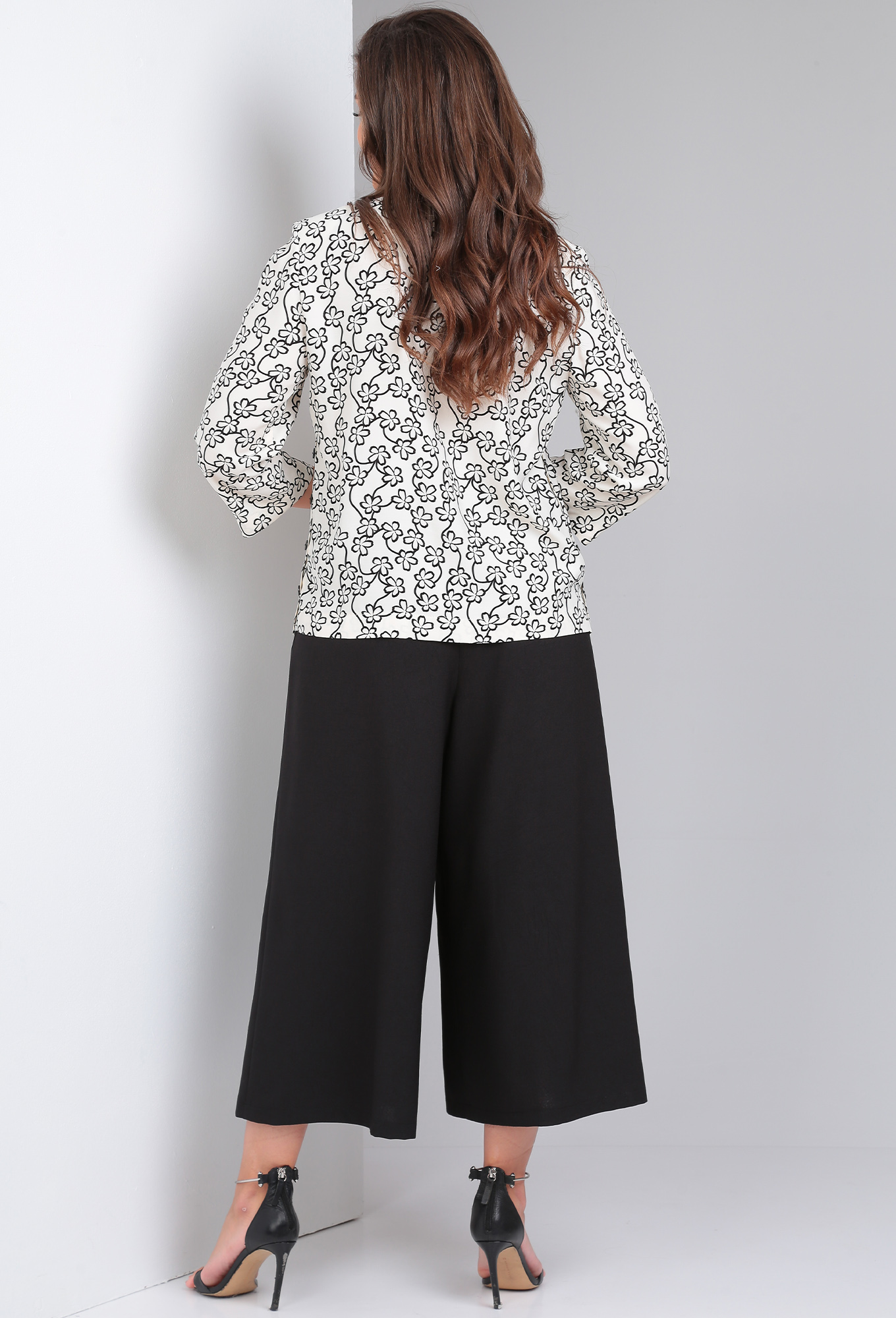 Модель: СВТ 579 молочно-черный цветы ..показатьРост: 164 см (рост модели на фото 170см) Сезон: Весна-Лето Тип ткани: лен 85%, пэ 10%, ликра 5%Летний костюм состоит с блузки и кюлотов.
