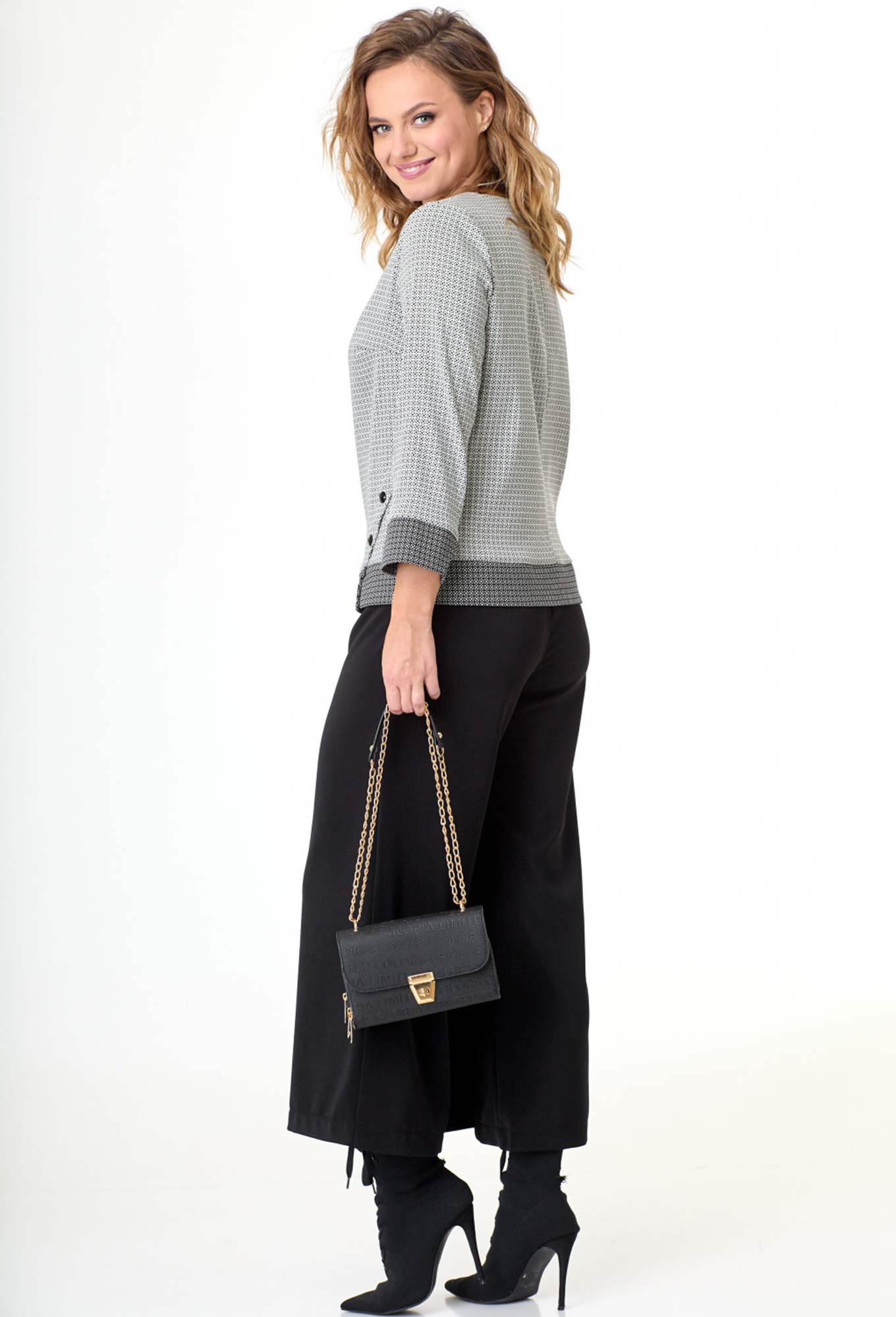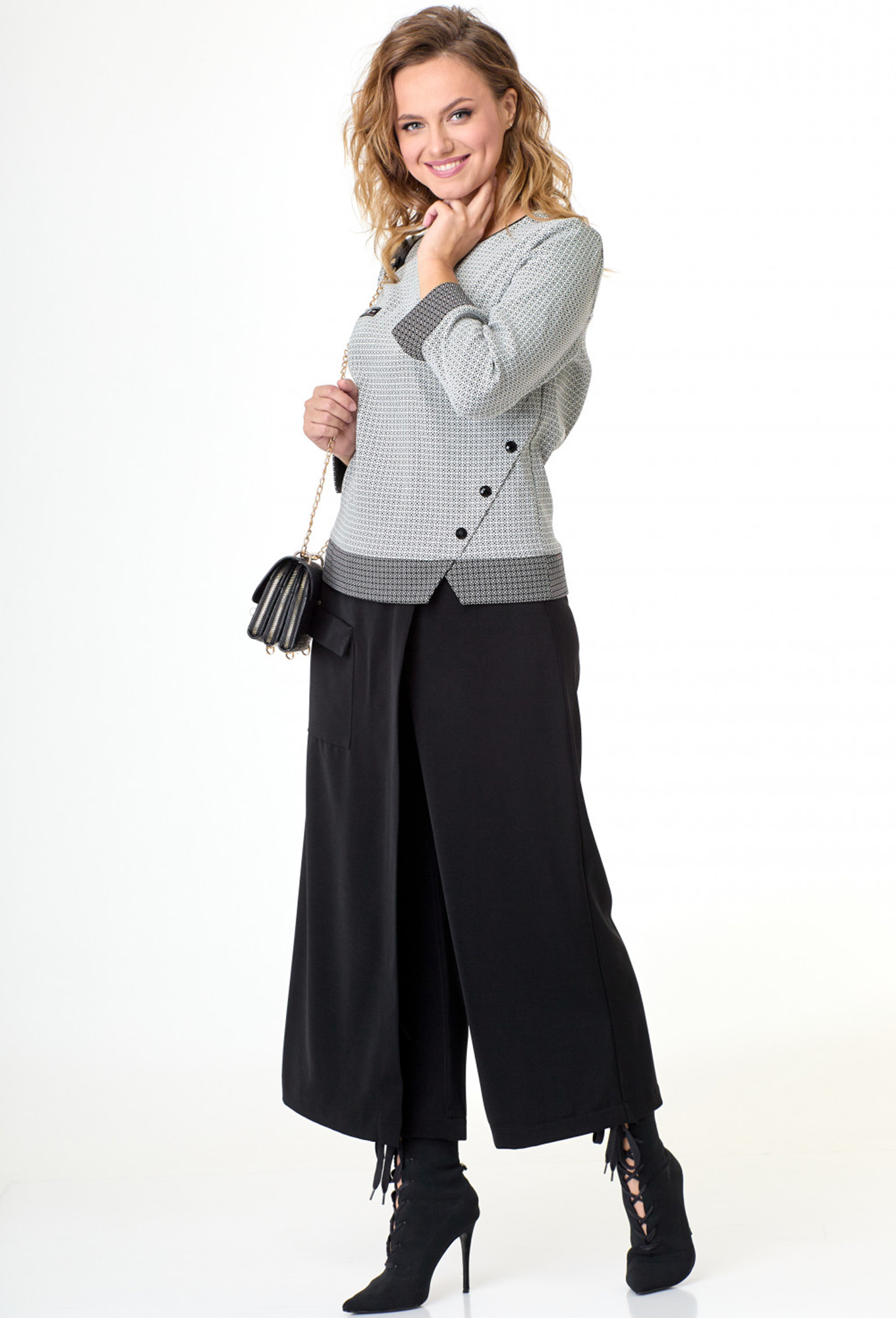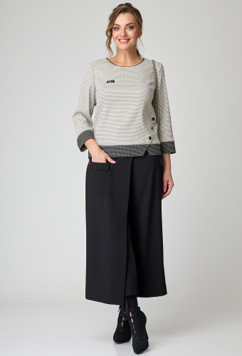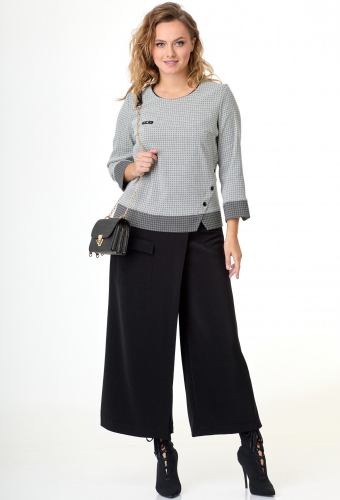 Модель: Таита Плюс 2232/1 черно-белый..показать Рост: 164 см (рост модели на фото 172см) Сезон: Круглогодичный Тип ткани: Блуза- 73% полиэстер, 23% вискоза, 4% эластанКюлоты- 95% полиэстер, 5% спандексСтильный , элегантный комплект состоит из блузона и кюлот. Блузон полуприлегающего силуэта с кокетками по низу и рукавам. Сбоку интересная деталь, переходит в разрез. Горловина отделана кантом, по переду аппликация. Рукав 7/8 - 51 см. Длина блузона по спинке от плеча -60 см. Кюлоты с интересной отлетной деталью по переду и накладным функциональным карманом. Длина брюк - 91 см. Рост: 164 см (рост модели на фото 172см) Сезон: Круглогодичный Тип ткани: Блуза- 73% полиэстер, 23% вискоза, 4% эластанКюлоты- 95% полиэстер, 5% спандекс