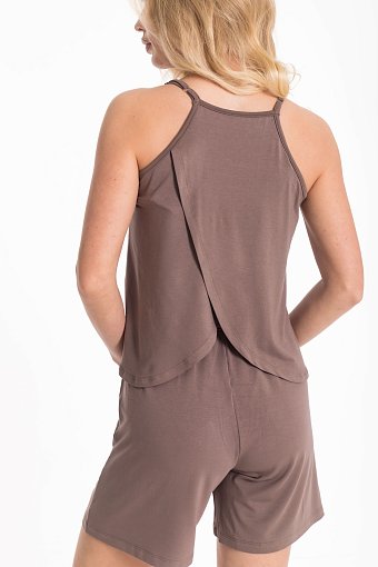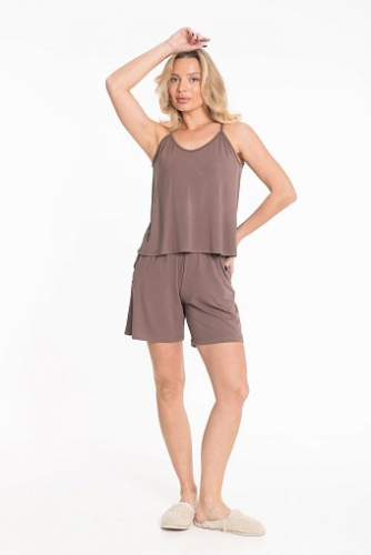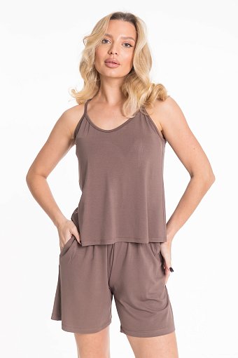 Пижама из мягкой однотонной вискозы — лёгкий и удобный комплект для сна и отдыха. В комплект входят топ и шорты. Топ с регулируемыми бретелями идеально садится по фигуре, а спинка из двух деталей на запах добавляет оригинальности и лёгкости образу. Шорты длиной до середины бедра выполнены с поясом на мягкой резинке и боковыми карманами, обеспечивающими комфорт и практичность.