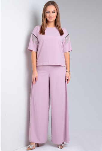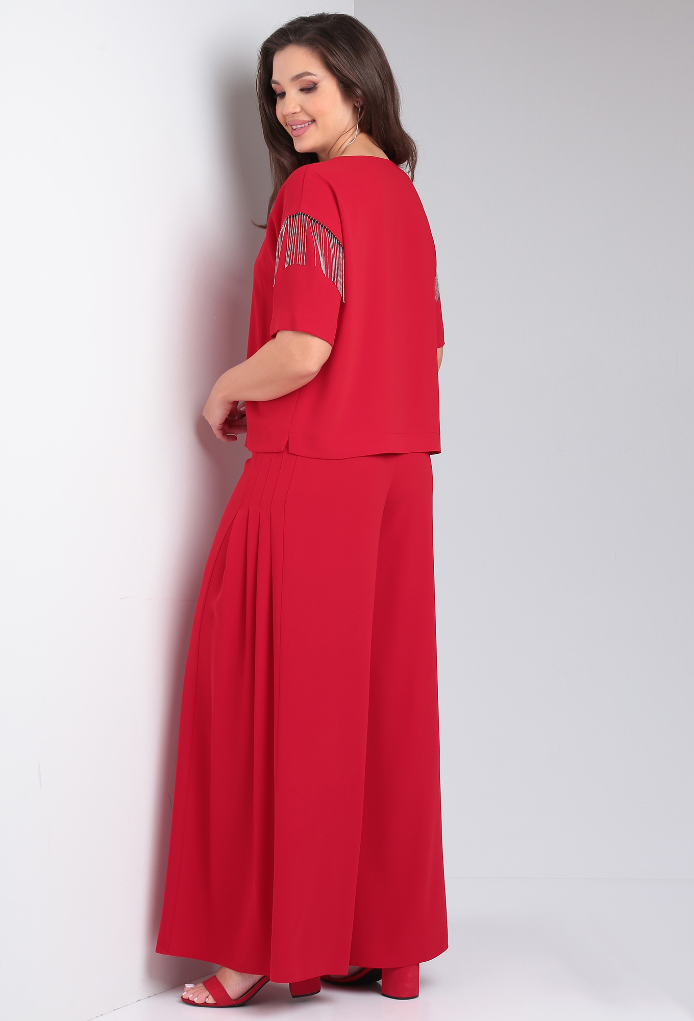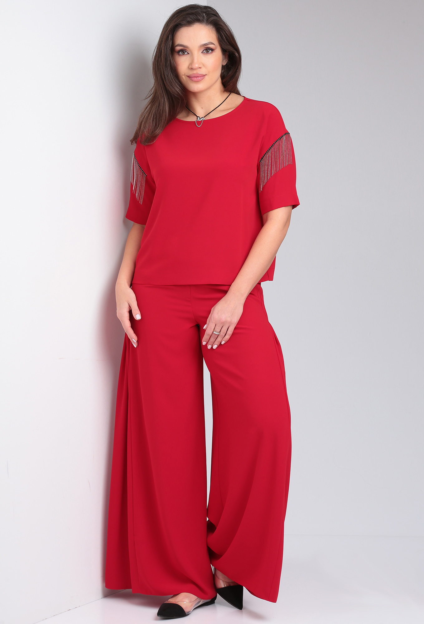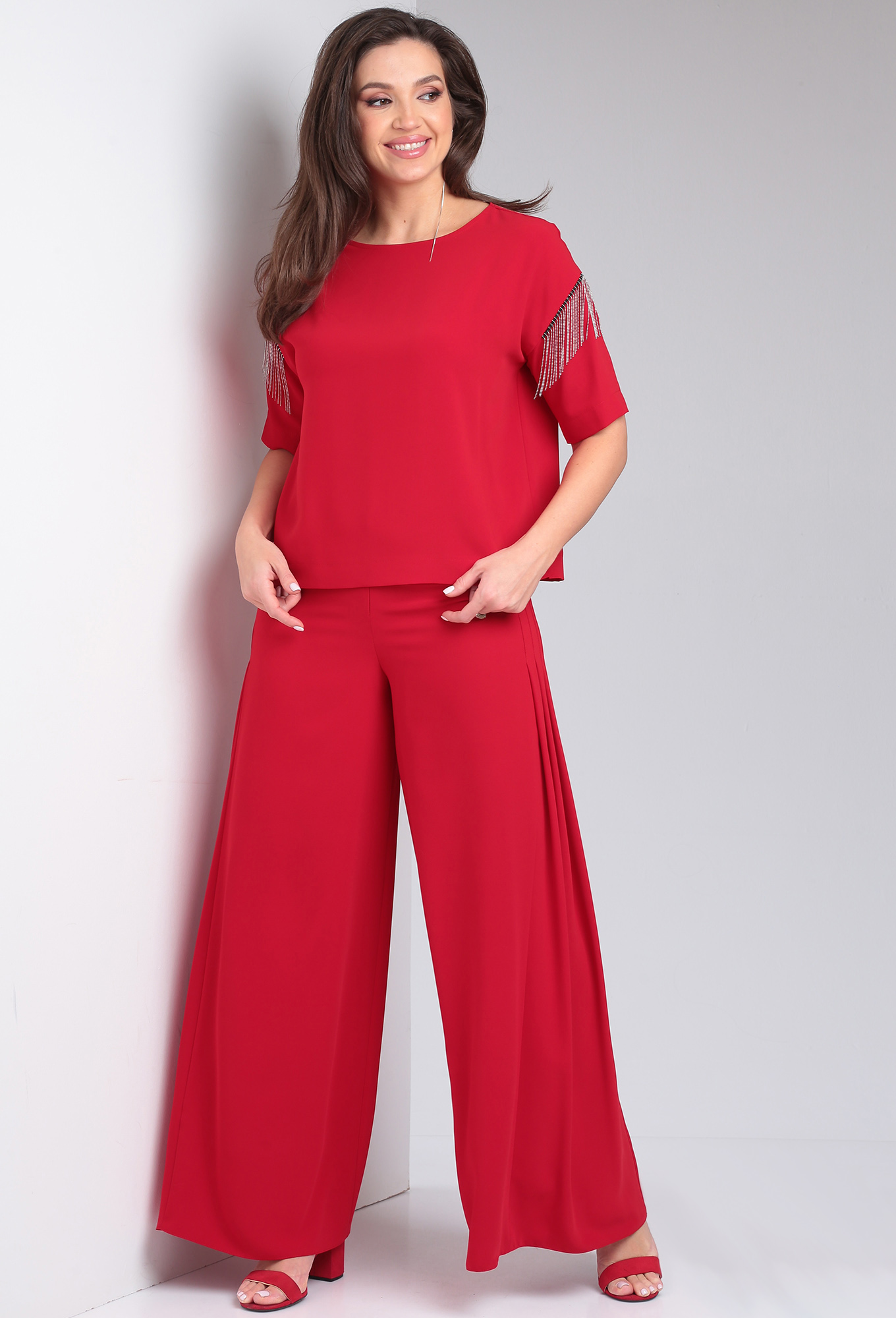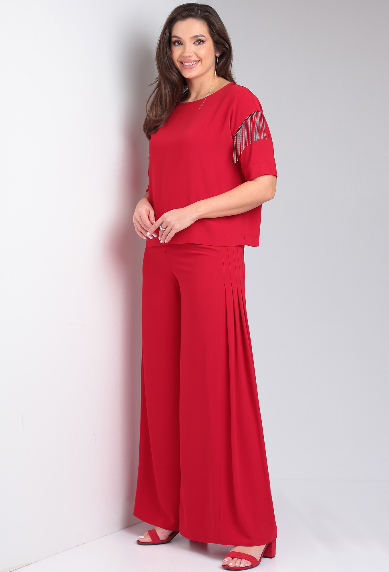Модель: ВИЛЕНА 944 красный Рост: ..показать164 см (девушка на фото ростом 170см) Сезон: Весна-Лето Тип ткани: 100% ПЭКостюм женский двухпредметный, состоит из блузы и брюк. Блуза прямого силуэта со спущенной линией плеча. Вырез горловины лодочкой. Спинка цельная. В боковых швах обработаны разрезы. Рукав короткий одношовный, декорированный в верхней части тесьмой - бахромой. Брюки расширенные к низу с притачным поясом. Застёжка на потайную тесьму - молнию в среднем шве и 1 петлю-пуговицу по поясу. На передних и задних половинках обработаны вытачки. По верхней части передних половинок брюк застрочены 4 односторонние складки с двух сторон.
