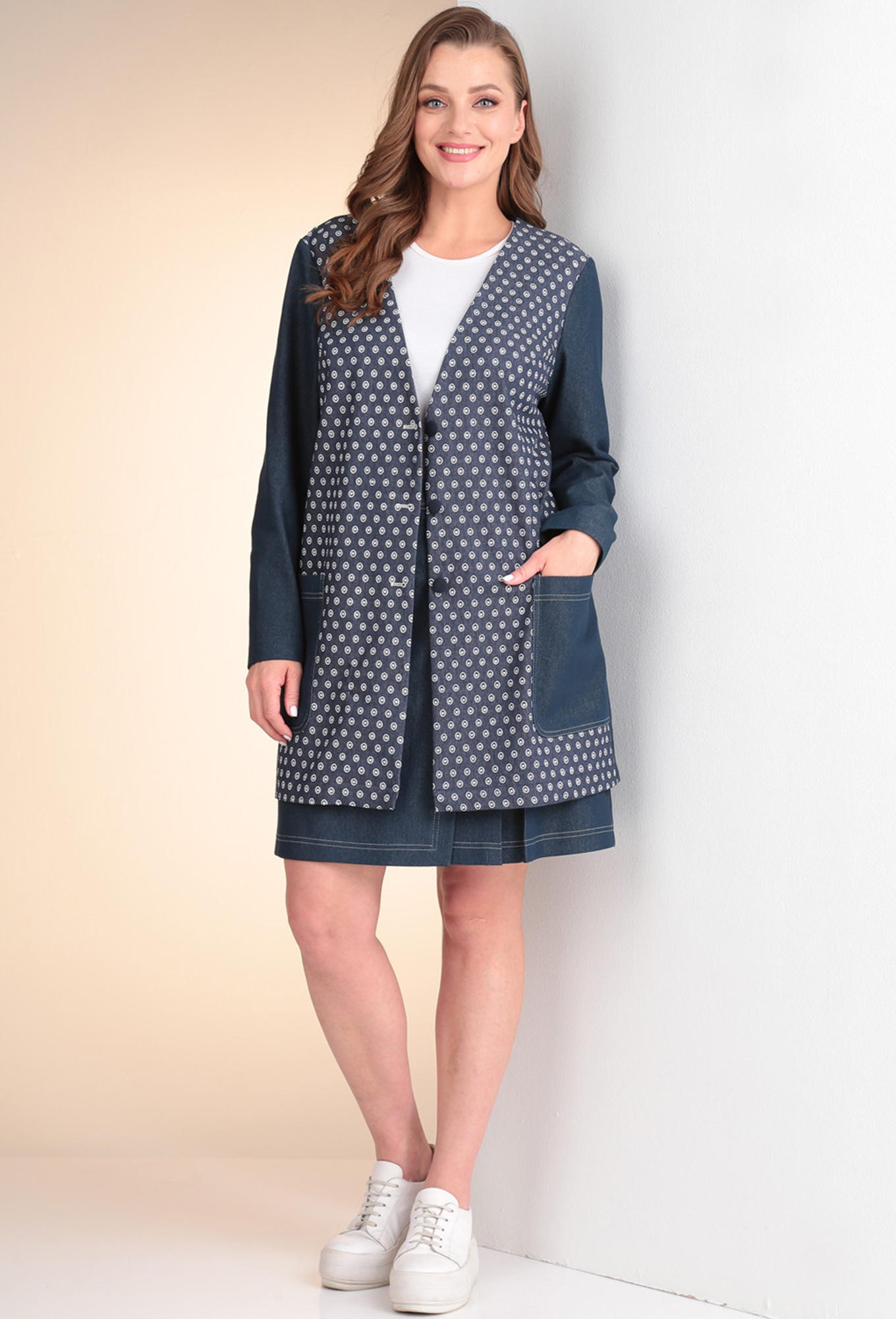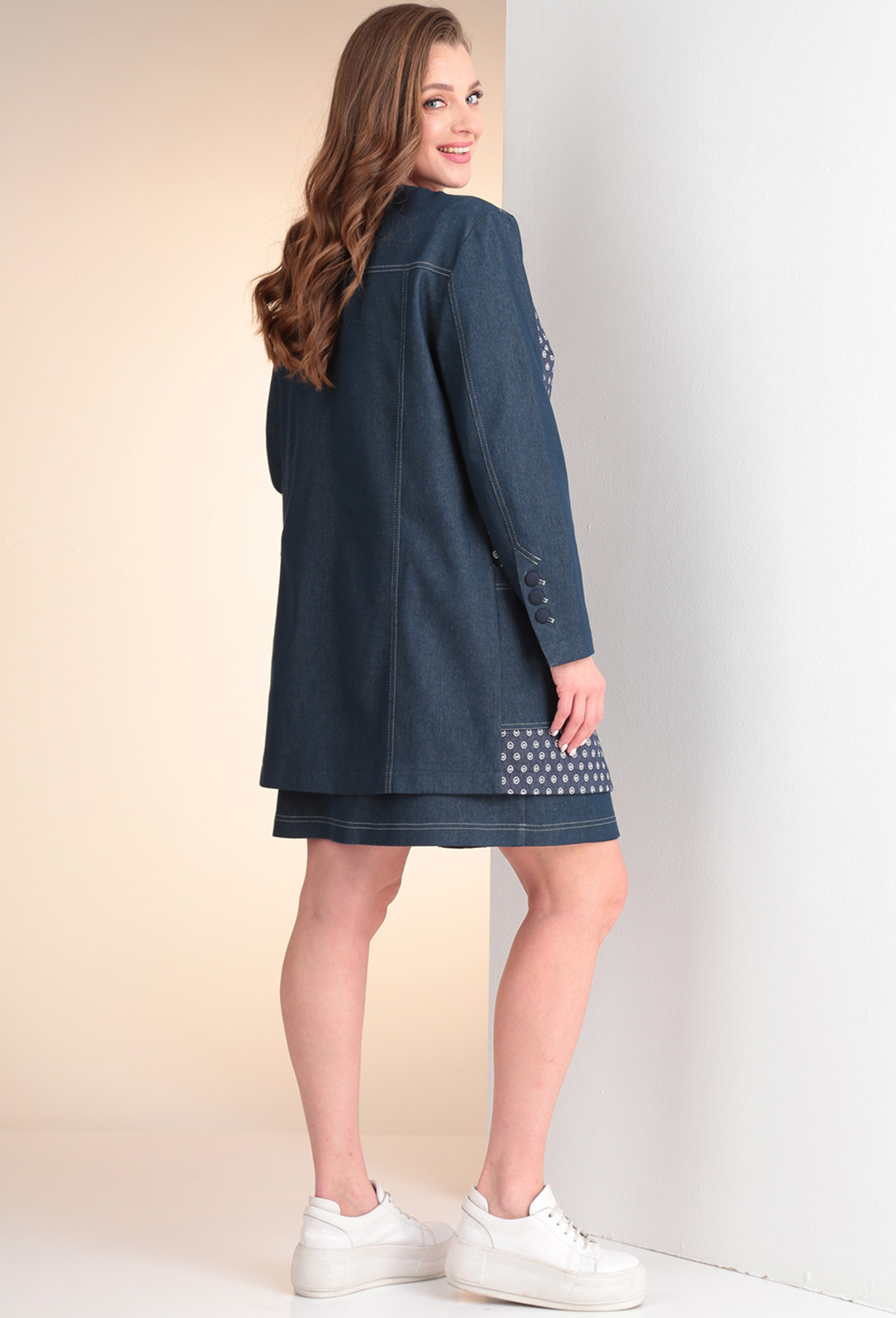 Модель: Виола Стайл 2338 джинс Ро..показатьст: 164 см (рост модели на фото 170см) Сезон: Весна-Лето Тип ткани: Хлопок 76%, полиэстер 22%, эластан 2%Джинсовый комплект из двух предметов: жакет и юбка. Стильный жакет современного прямого силуэта, с застежкой на 3 пуговицы. Спереди обработаны накладные карманы. Рукава втачные, по низу с застежкой на пуговицы. Юбка А-силуэта с имитацией запаха по переду и встречной складкой. Застежка на потайную молнию в боковом шве юбки.