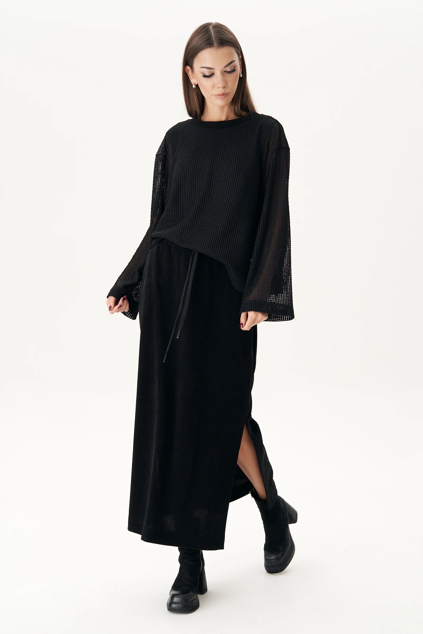 Тренд на готовый костюм с юбкой - идеальное решение для тех, кто не хочет отказываться от мягкости и уюта трикотажного полотна, а также сохраняет своё время. Такой комплект создаёт максимально тёплый, элегантный и одновременно стильный образ. Юбка макси, прямая на притачном эластичном поясе с люверсами и отделочным шнуром в кулисе, наклонными боковыми карманами и разрезом сбоку, из текстильного трикотажного полотна эффекта вельвет. Джемпер свободного силуэта, покроя с заниженной линией плеча. Рукав слегка расширенный к низу. Обтачка горловины из отделочного текстурного трикотажа. Современный и стильный кроп-топ подчеркнет вашу модную натуру, создавая актуальный образ. Декоративная строчка добавляет изысканности и оригинальности, делая его уникальным. Длина джемпера около 60 см. Длина рукава с плечом около 76 см. Длина юбки около 90 см.