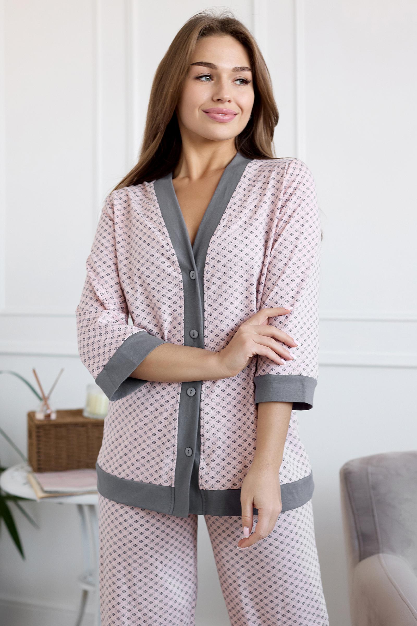 Нежный и мягкий женский комплект из 100% хлопка. Состоит из кофточки на пуговицах свободного кроя и легких, широких брюк. Красивое цветовое сочетание подчеркивает женственность своей обладательницы. Отличный подарок для подруги, сестры, мамы на любой праздник.