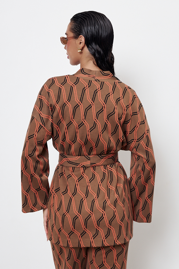 Костюм из эластичного полотна. Брюки прямого силуэта. Пояс притачной с эластичной резиной. Кардиган свободного силуэта с притачной планкой. Втачной широкий рукав в спущенную пройму. В комплекте пояс из основной ткани.