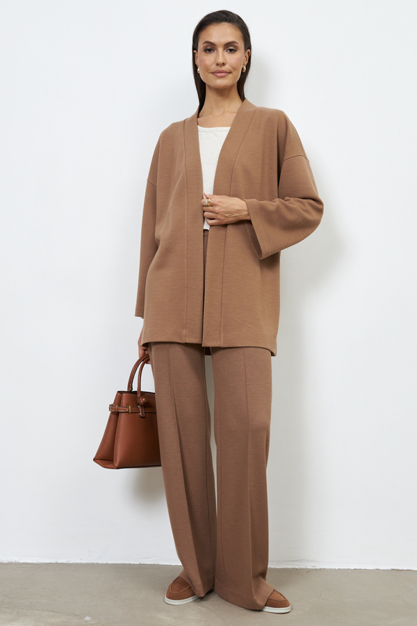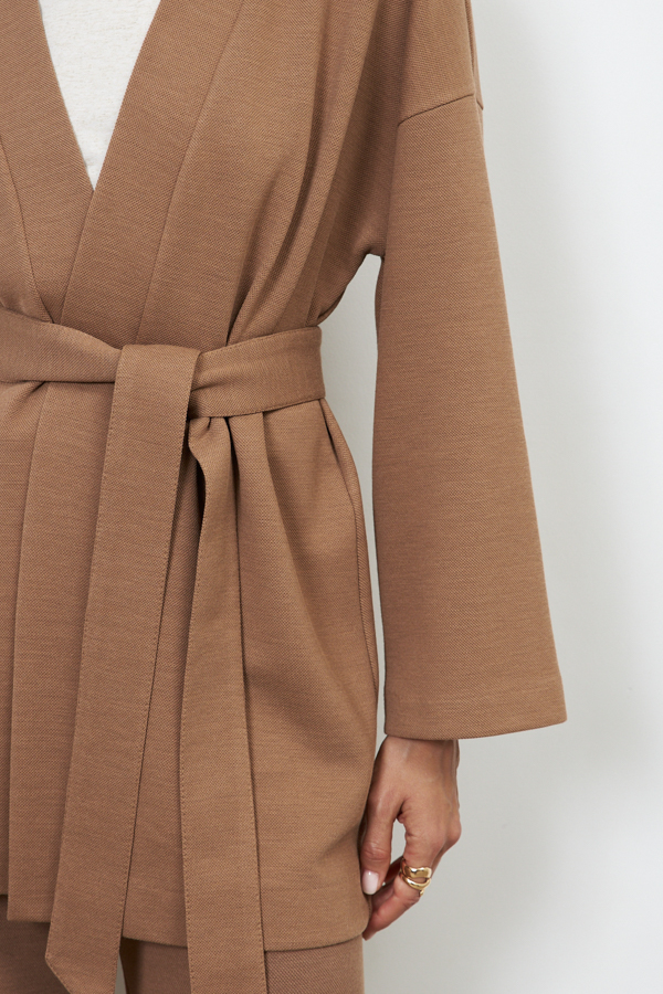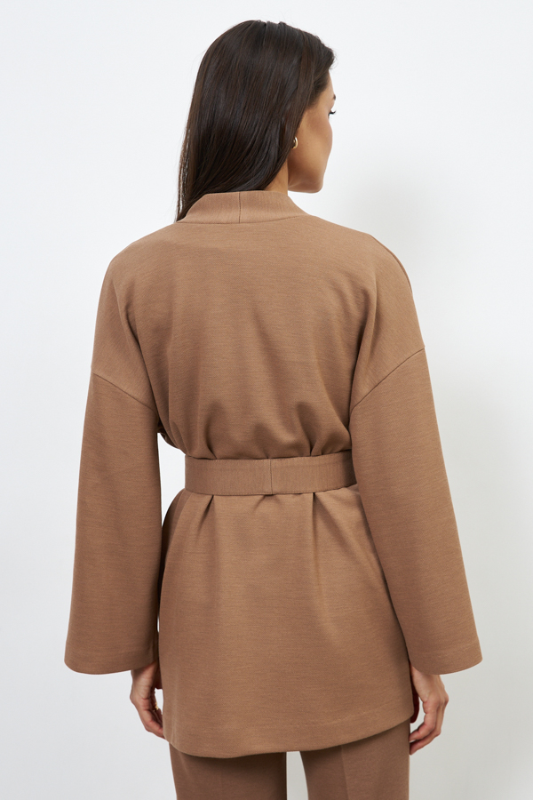 Кардиган из эластичного полотна свободного силуэта с притачной планкой. Втачной широкий рукав в спущенную пройму. В комплекте пояс, позволяющий создавать приталенный силуэт.