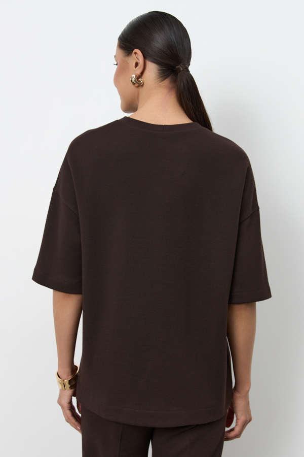 Джемпер свободного силуэта со спущенной линией плеча и рукавом до локтя выполнен из эластичного полотна. Вырез горловины оформлен бейкой из основной ткани. В таблице размеров представлены параметры человека, а не изделия.