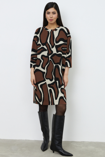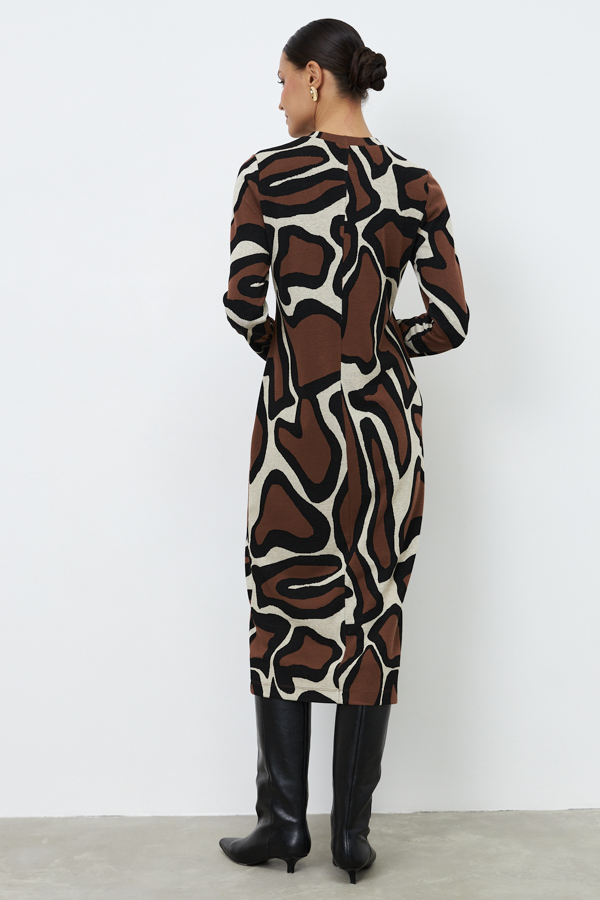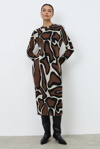 Платье полуприлегающего силуэта из эластичного полотна. Круглый вырез горловины оформлен притачной бейкой. Втачной длинный рукав.