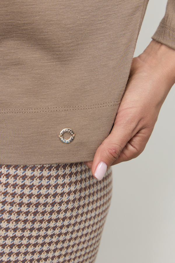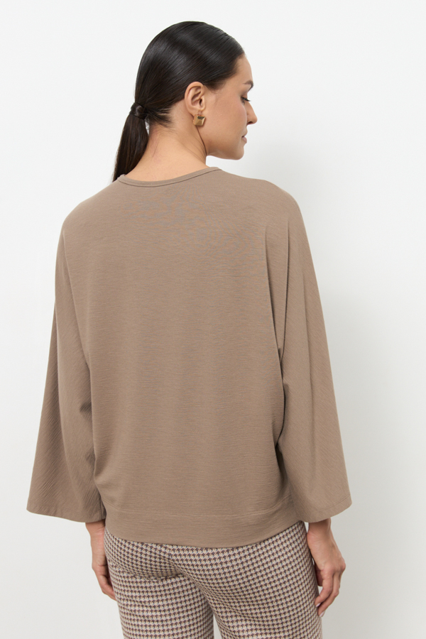 Джемпер из вискозного эластичного полотна свободного силуэта. Изделие оригинального кроя с одним цельнокроеным рукавом. Круглый вырез горловины и линия проймы окантованы эластичными бейками.