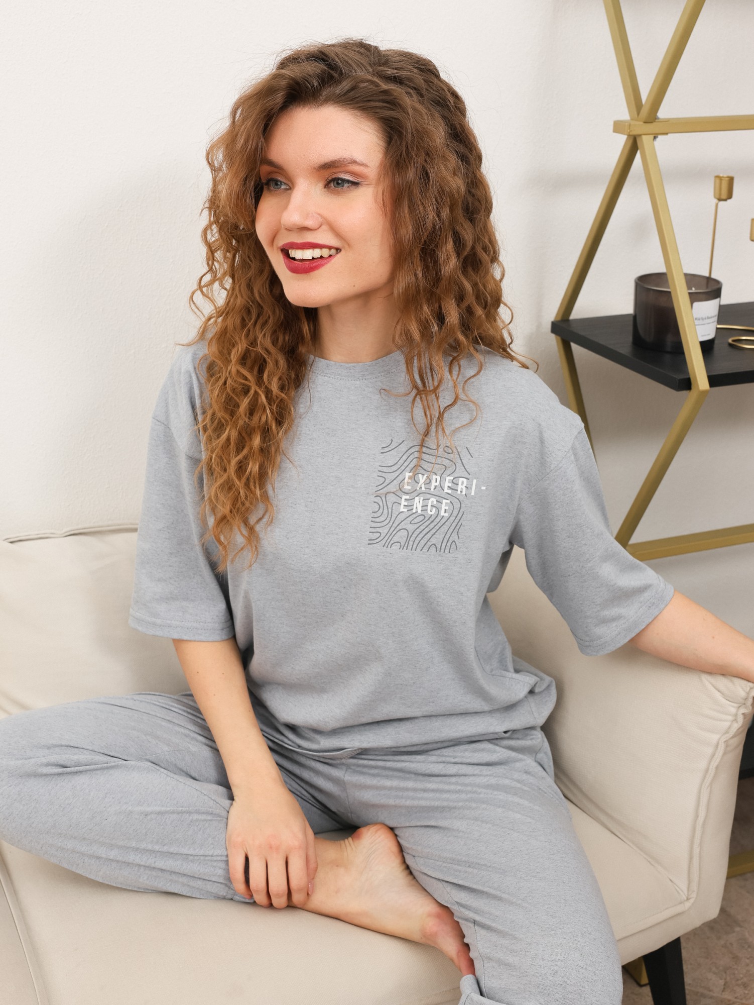 Костюм женский из трикотажного меланжированного полотна «кулирка», состоящий из футболки и брюк. Футболка – со спущенным плечом, втачными короткими рукавами, горловиной овальной формы и принтом на полочке, выполненным способом «шелкографии». Горловина обработана втачной планкой.Брюки – длинные, на притачном поясе с эластичной тесьмой внутри и карманами в боковых швах. Нижние срезы обработаны с эластичной тесьмой.