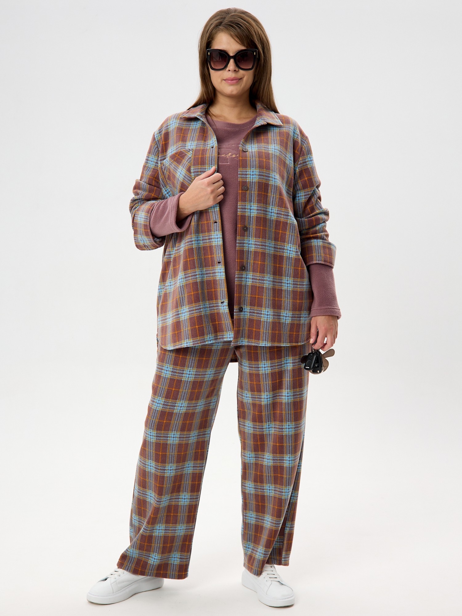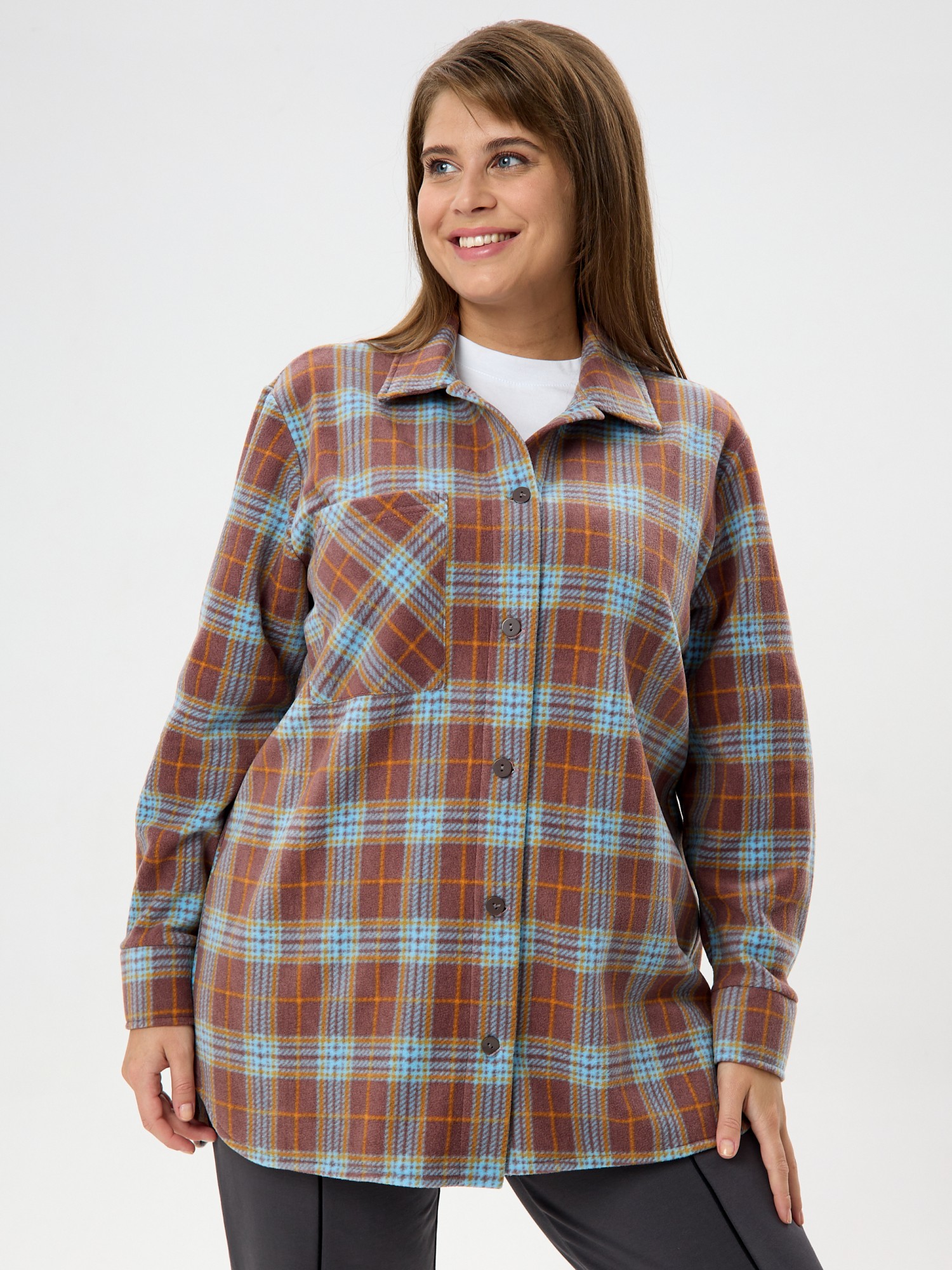 Рубашка (туника) женская из трикотажного полотна «флис» с набивным рисунком «клетка», свободного силуэта, с длинными втачными рукавами напритачных манжетах, стояче-отложным воротником, нагрудным карманом,фигурным низом и центральной бортовой застежкой на петли и пуговицы. Спинка – с отрезной кокеткой и бантовой складкой в центре соединительного шва.