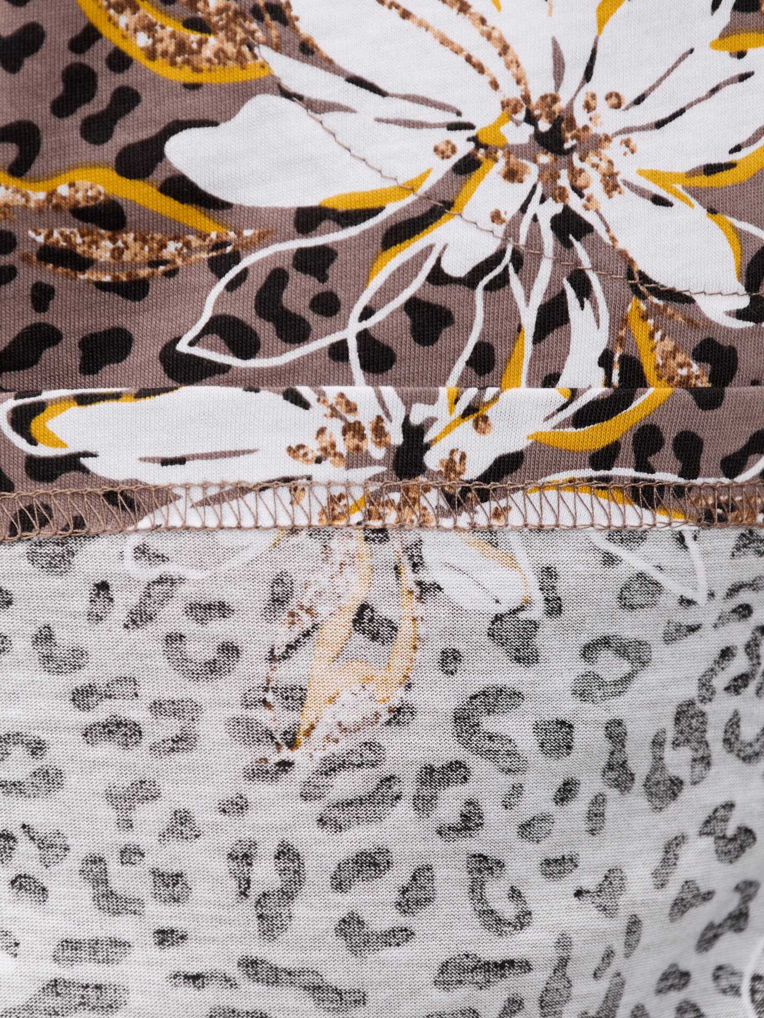Халат женский из трикотажного полотна «кулирка» с набивным рисунком, прямого силуэта, с короткими втачными рукавами, горловиной овальной формы, карманами в боковых швах и центральной бортовой застежкой на тесьму «молния». Бортовые срезы, горловина и входы в карманы окантованы контрастным материалом.