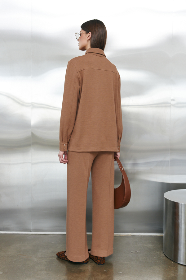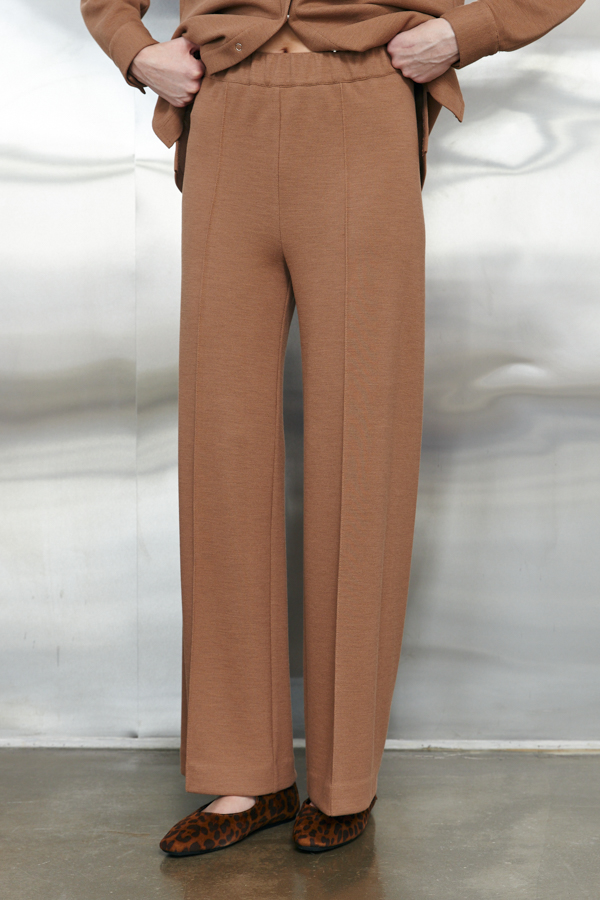 Брюки прямого силуэта из эластичного полотна. Пояс притачной с эластичной резиной. На передней части брюк застрочены стрелки.