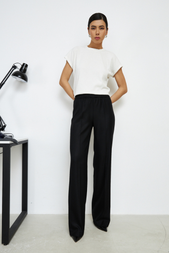 Брюки прямого силуэта из костюмной ткани. Пояс притачной с эластичной резиной.