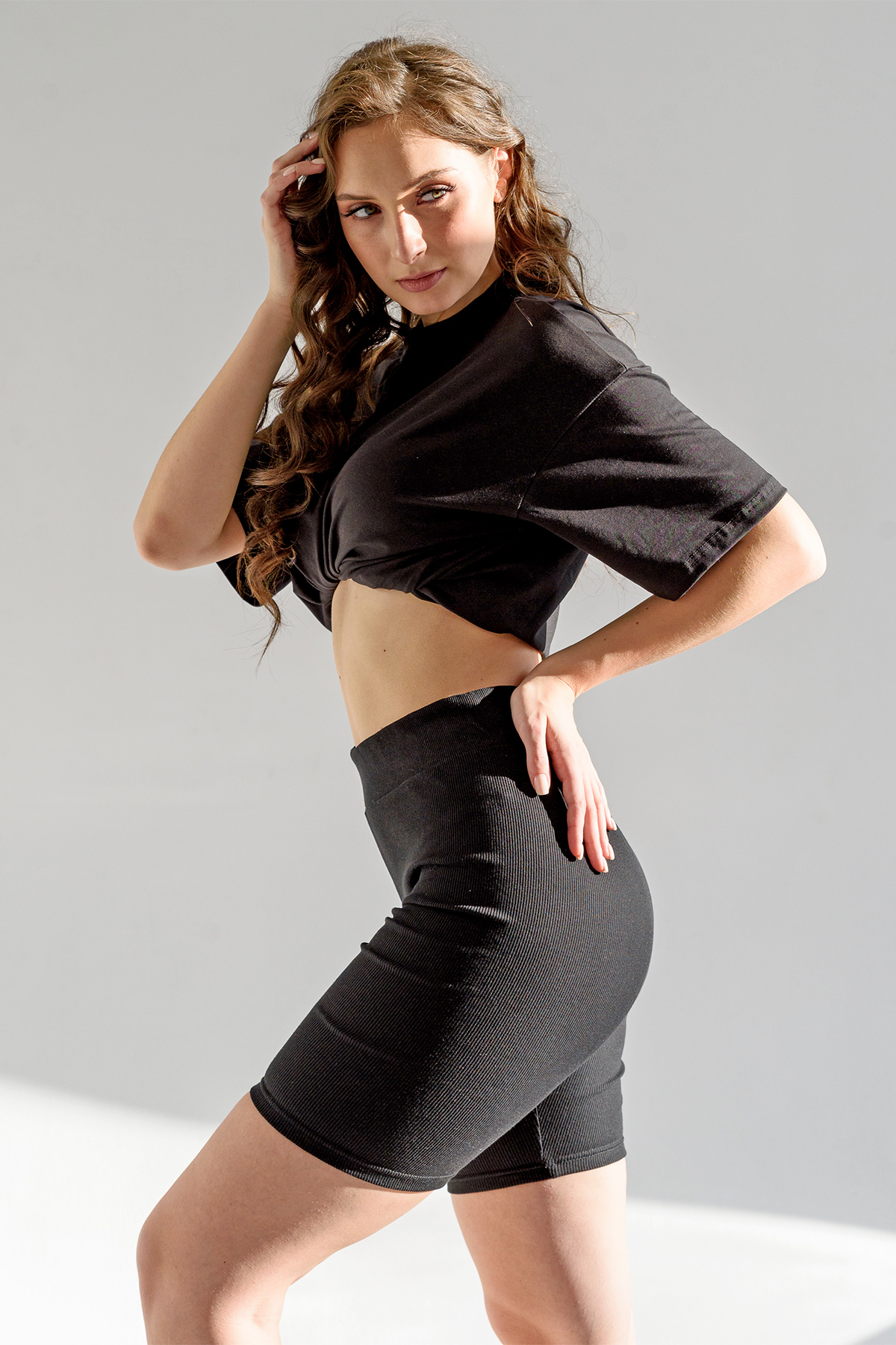 Велосипедки легко сочетаются с кроп-топом, майкой или футболкой.