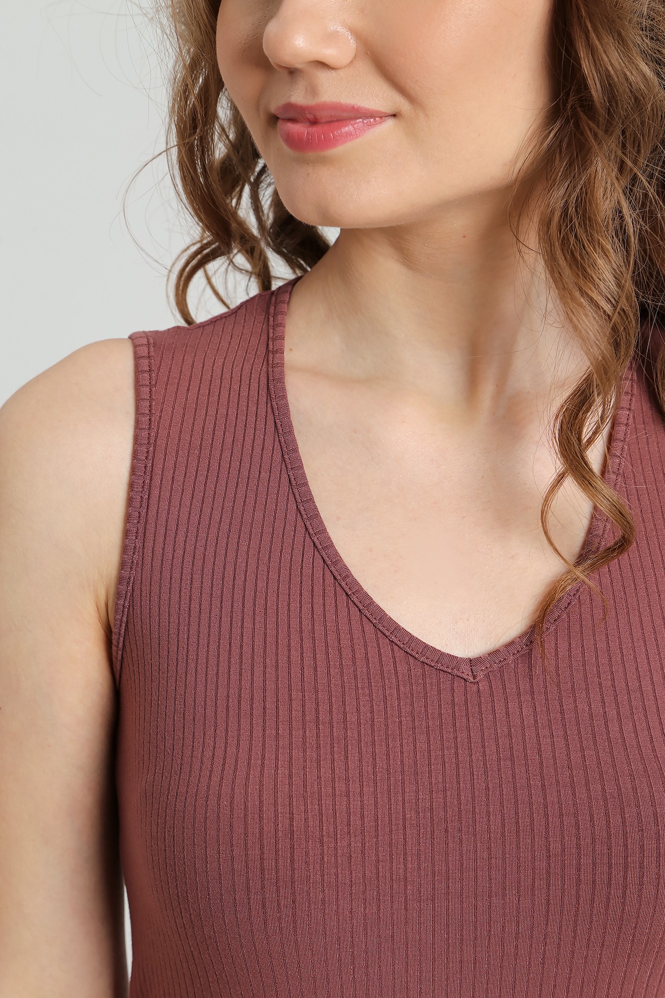 Платье молодежное из гладкокрашеного полотна «лапша», прилегающего силуэта, без рукавов, с горловиной V-образной формы. Спинка – со средним швом и разрезом. Горловина и проймы окантованы основным материалом.