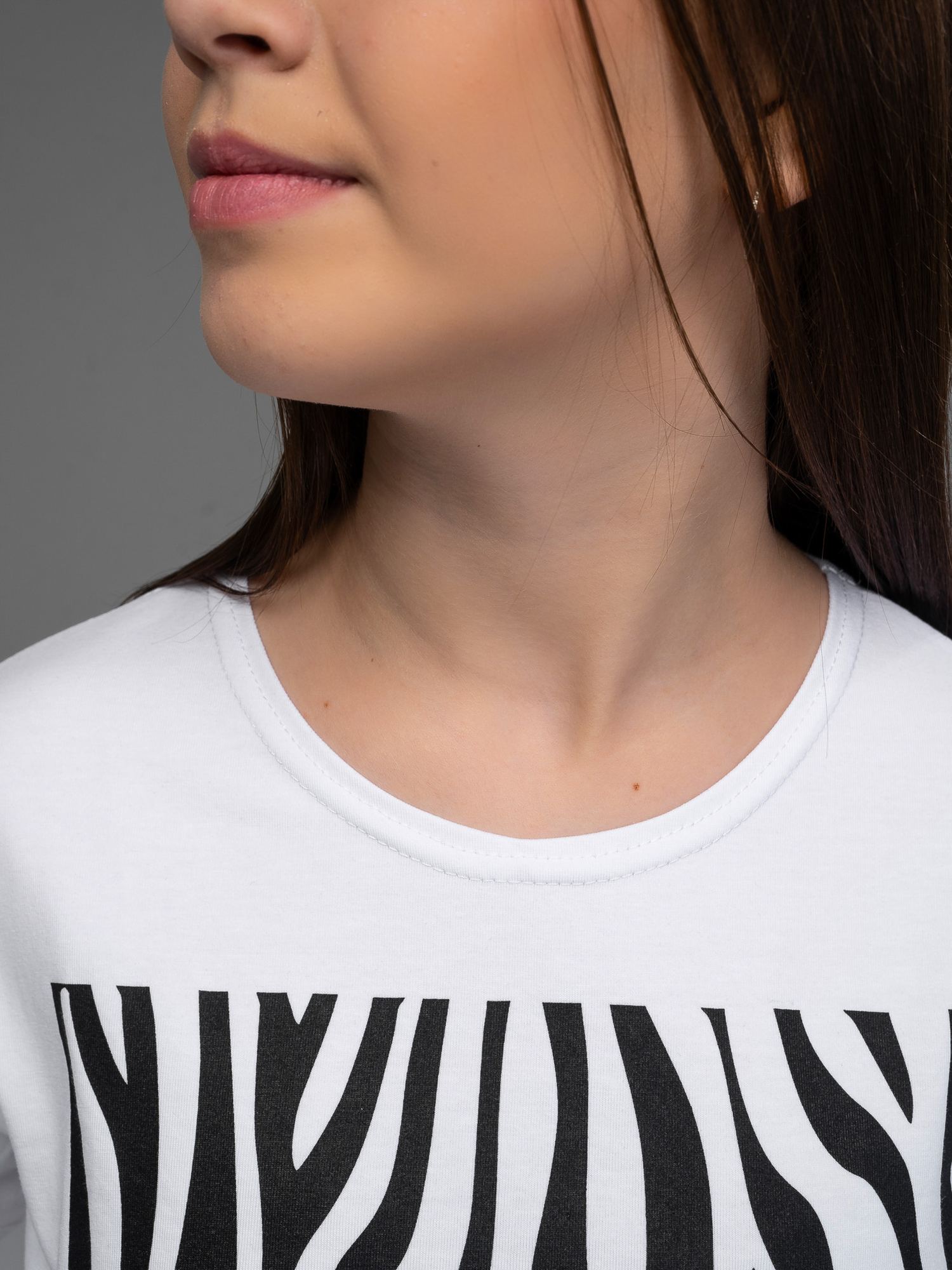 Костюм двойка для девочки из футера белого цвета для девочки состоит из футболки свободного силуэта со спущенной линией плеча, рукавами до уровня локтя и брюк- клеш. На груди футболки- яркий анималистичный принт. Костюм двойка- это отличный выбор для создания модного и стильного летнего образа. Превосходное сочетание практичности и удобства, этот костюм станет незаменимым элементом гардероба Вашей девочки. Привлекательный, летний дизайн и свободная посадка обеспечивают комфорт даже в самые жаркие дни.
