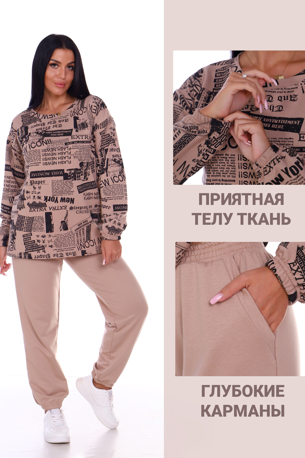 Стильный женский костюм со свитшотом и прямыми штанами на резинке с карманами. Внизу они собраны на резинку в виде манжеты. Поможет Вам быть в тренде этого сезона! Брюки подходят для любого типа фигуры, скрывают ее недостатки и подчеркивают достоинства. Костюм из мягкой кофты со спущенным рукавом и брюками прекрасно подойдет для вечерних и повседневных образов, для прогулок и занятий спортом, а также в качестве костюма для дома. Такой фасон может быть женственным и легким. Брюки из футера очень удобны в качестве повседневной одежды, не сковывают движения. Костюм двойка выполнен из плотной ткани футер 2х нитка (петля), не теряет форму после многочисленных стирок, не скатывается.