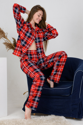Костюм домашний. Кофточка с отложным воротником с цельнокроенными подбортами, на пуговицах, с манжетами. Свободный крой, спущенная линия плеча. Длина рукава в измерениях указана от точки основания шеи. Карманы в боковых швах брюк. Пояс на плотной резинке 3 см. 100% содержание натурального хлопка в полотне делает изделие невероятно комфортным и дышащим.