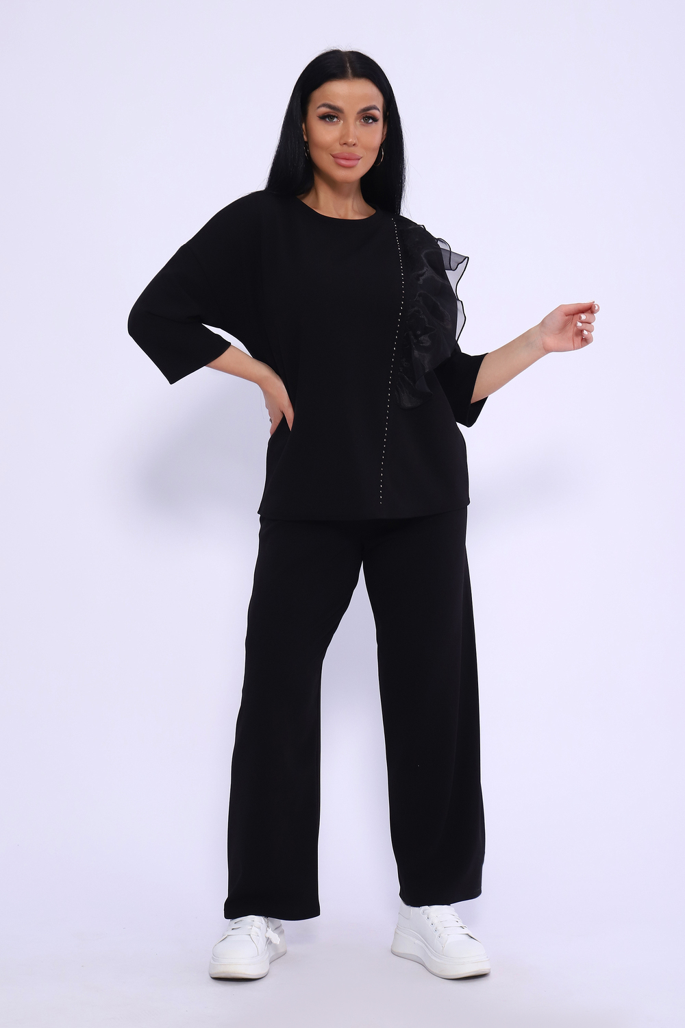 Модель свободного силуэта состоит из брюк палаццо и туники с рукавом 3\4. По переду туники дорожка из страз и оборка из органзы, что делает костюм интересным и эффектным. Брюки с очень удобной высокой посадкой, а туника тоже комфортно и свободно подойдёт практически на любую фигуру. Добавьте этот образ в свой праздничный или повседневный день, и ваша жизнь будет более красочной. В замерах длина рукава указана от начала горловины.