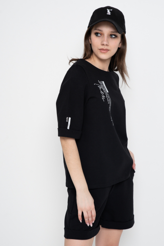 Стильный женский брючный костюм с оригинальным принтом выполнен в стиле спорт шик и умеренного oversize. Костюм состоит из укороченного спереди лонгслива с длинным рукавом, округлым вырезом горловины, разрезами по бокам и прямых брюк с удобной широкой резинкой на поясе с двумя боковыми карманами. Наш брючный костюм выполнен из мягкой трикотажной ткани. Благодаря свободному верху и удобной посадке брюк Вам будет комфортно носить костюм каждый день. Женский костюм двойка подходит для повседневной носки, работы в офисе или посещение школы, а также для торжественных мероприятий.