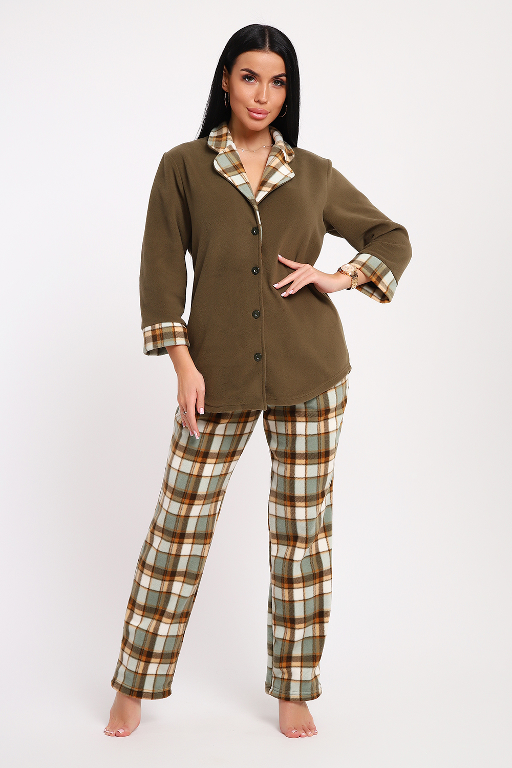 Домашний женский костюм из мягкого, теплого флиса. Кофта полуприлегающего силуэта, застегивается на петли и пуговицы. Длиной до бедер с фигурной линией низа. Рукав втачной, длиной 3/4 с манжетом из отделочной ткани. Воротник пиджачного типа с закругленными углами, из отделочной ткани. Борта, воротник и лацканы отстрочены. Домашние брюки прямого кроя с вместительными карманами в боковом шве, комфортный пояс на резинке, располагается на линии талии, длина брюк ниже щиколотки.