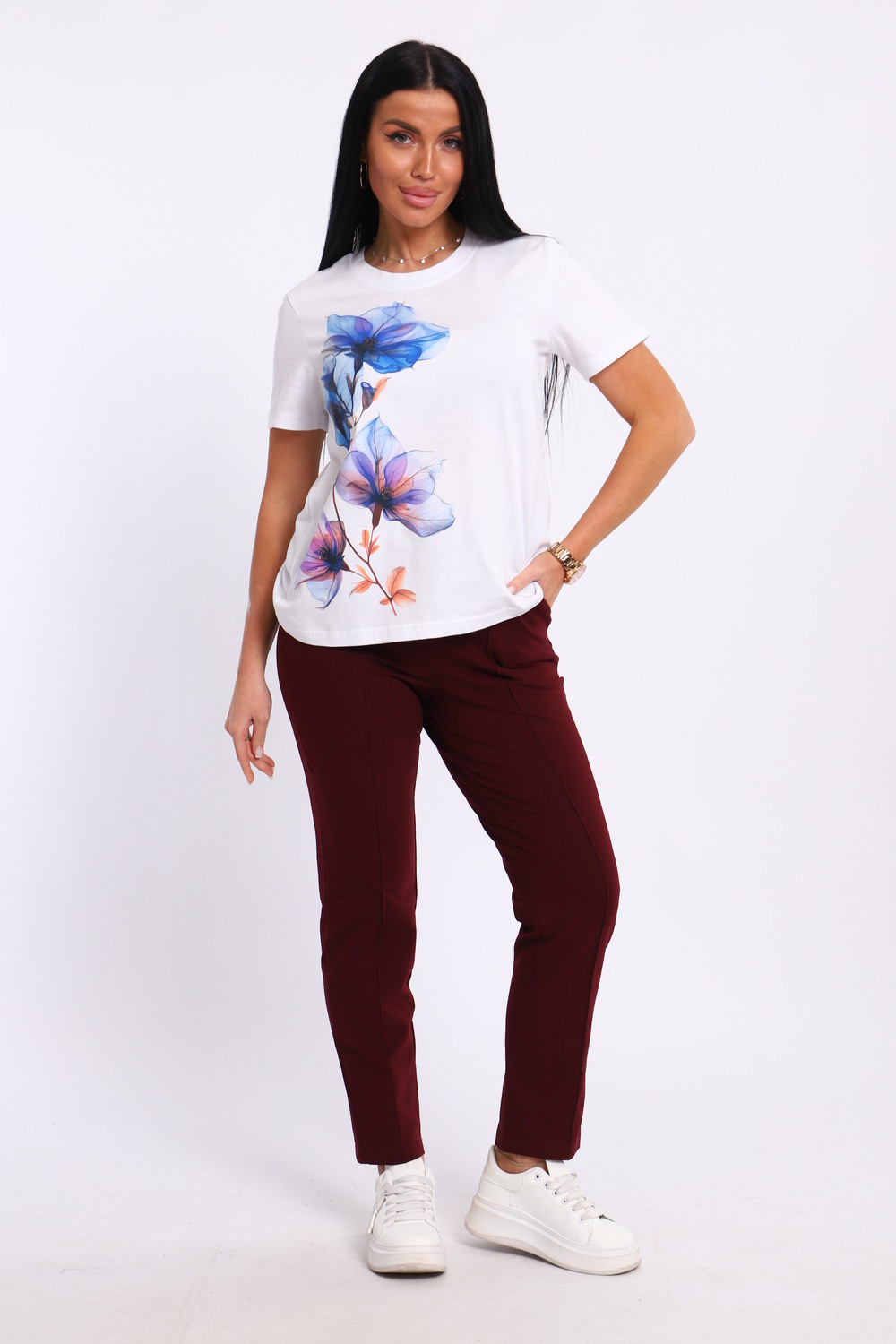 Представляем вашему вниманию современный костюм, состоящий из брюк и футболки. Брюки классические с отстроченной стрелкой спереди, двумя карманами, пояс на резинке. Футболка свободного кроя, с принтом. Костюм обладает отменными практическими характеристиками, и на долгое время сохранит свой первоначальный вид.