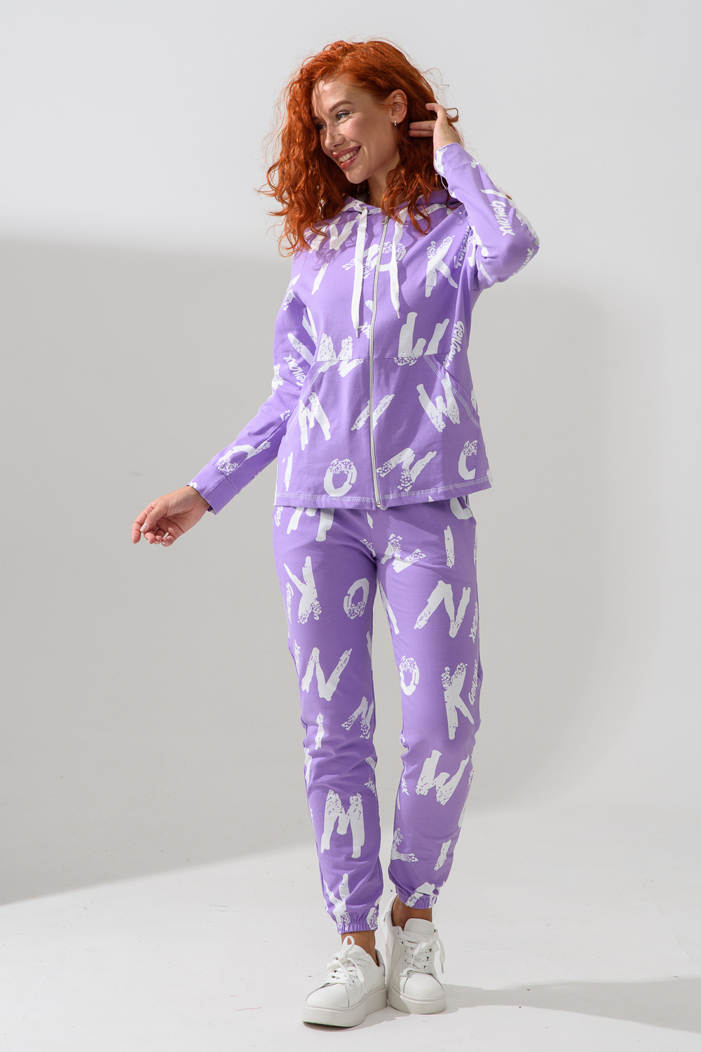 Костюм состоит из толстовки и брюк. Брюки на поясе, с боковыми карманами, на резинке по низу. Толстовка прямая, на молнии, с капюшоном из сетки, с карманами кенгуру, длиной до середины бедра. Рукав реглан, длинный, с лампасами из сетки вдоль рукава, на манжете.