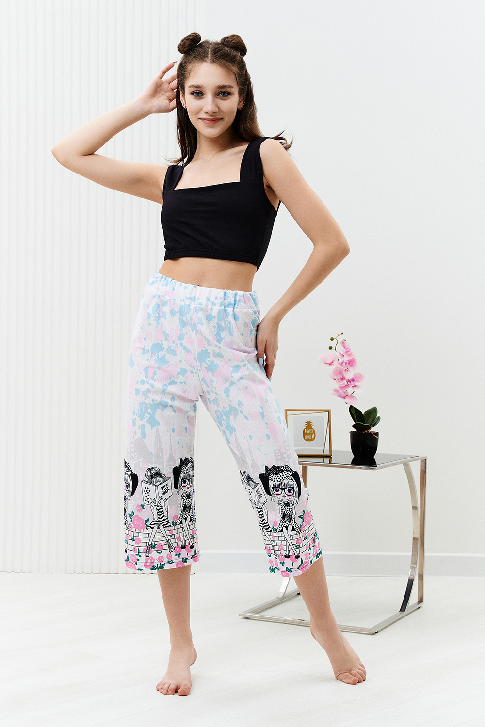 Комплект состоит из топа и укороченных брюк кюлот. Топ из кулирки с лайкрой на широких бретелях, с квадратной горловиной, длиной выше линии талии. Верх спинки и низ топа собраны на резинке. Проймы обработаны бейкой из основного полотна. Брюки из кулирки прямые, свободные, укороченные, на поясе.