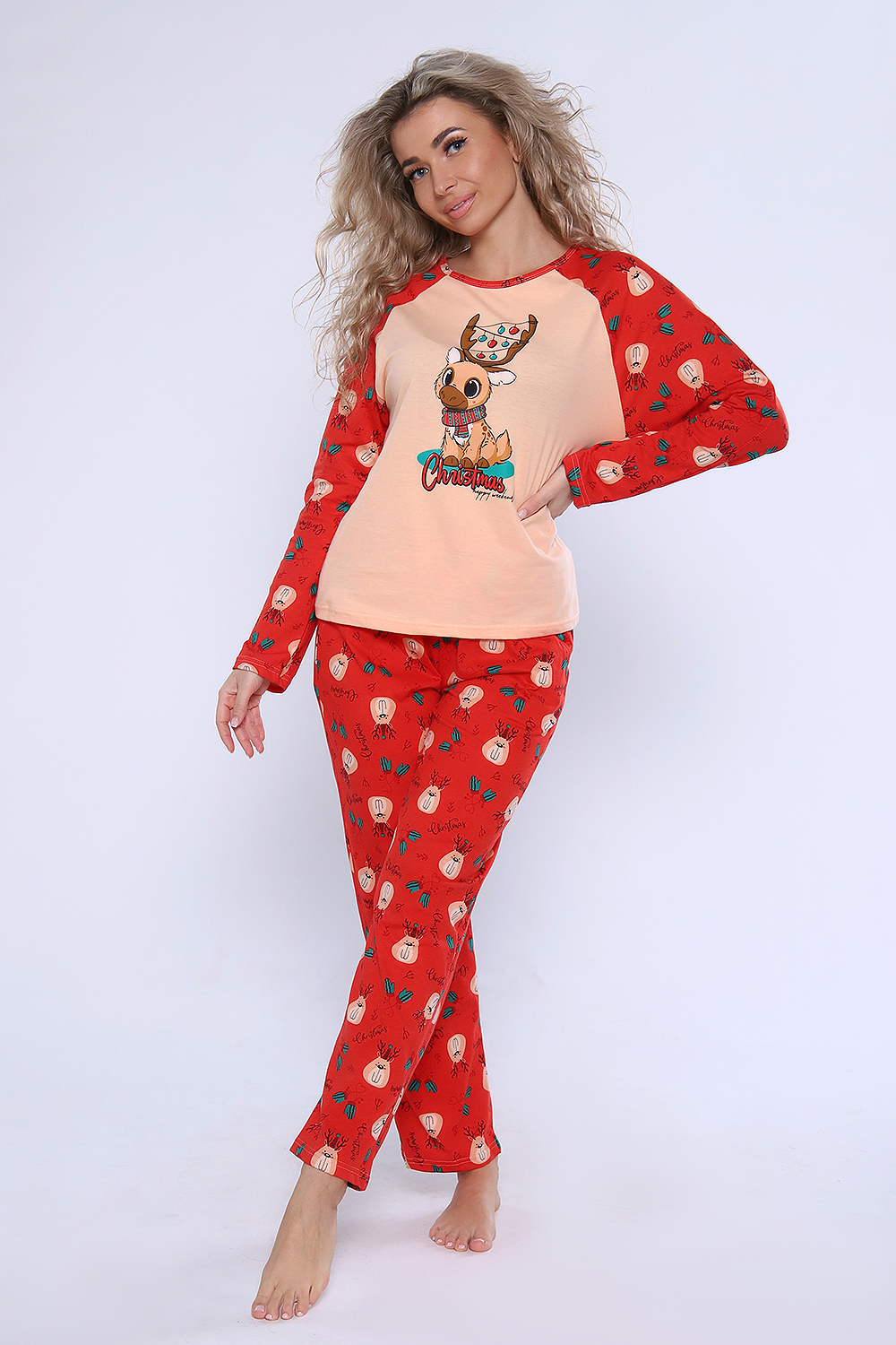 Костюм домашний состоит из кофты с длинным рукавом и брюк. Брюки с карманами. Кофта с рукавами - реглан и принтом. Удобный и практичный вариант для дома и сна.