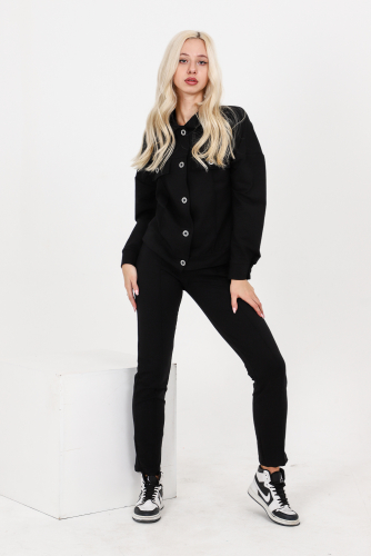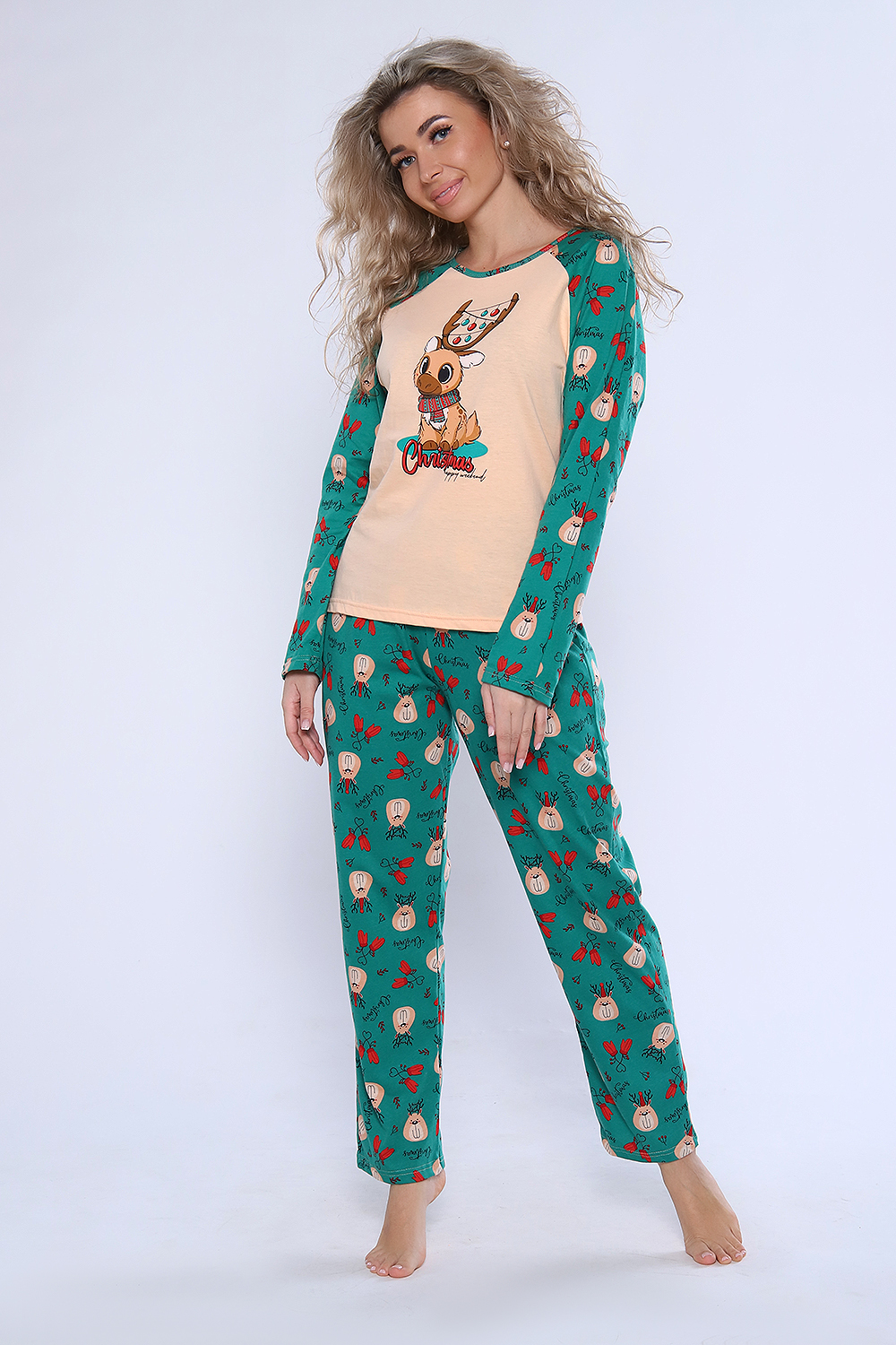 Костюм домашний состоит из кофты с длинным рукавом и брюк. Брюки с карманами. Кофта с рукавами - реглан и принтом. Удобный и практичный вариант для дома и сна.