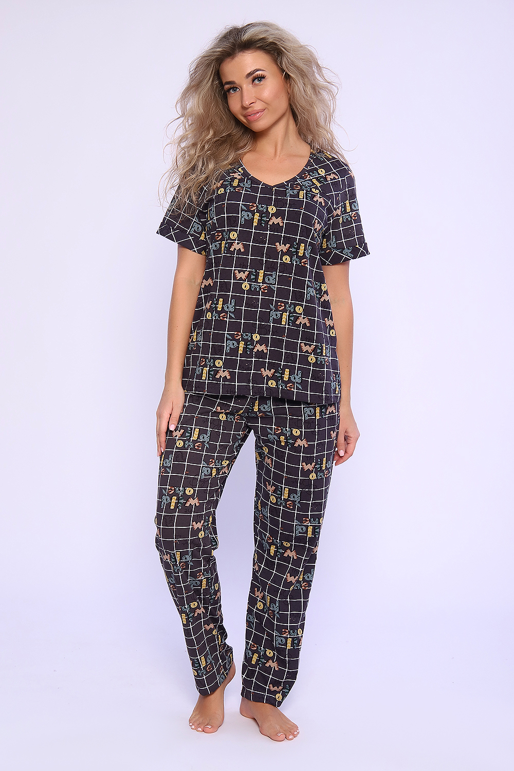 Костюм состоит из брюк и футболки. Брюки с карманами. Футболка с короткими рукавами на манжетах. Полочка с отрезными кокетками, скроенными по косой и V - образным вырезом горловины.