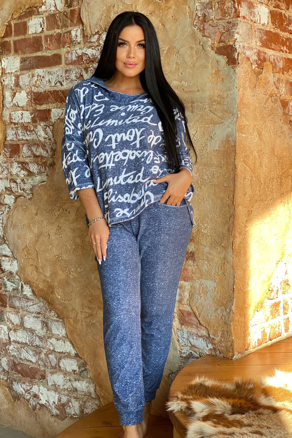 Костюм женский: туника и брюки. Туника прямого силуэта с цельнокроенным рукавом 3/4, со швом. Воротник отложной, спереди переходит в стойку. Полочка короче спинки, по боковым швам разрезы. Брюки полуприлегающие, с манжетами. На передней половинке внутренние карманы.