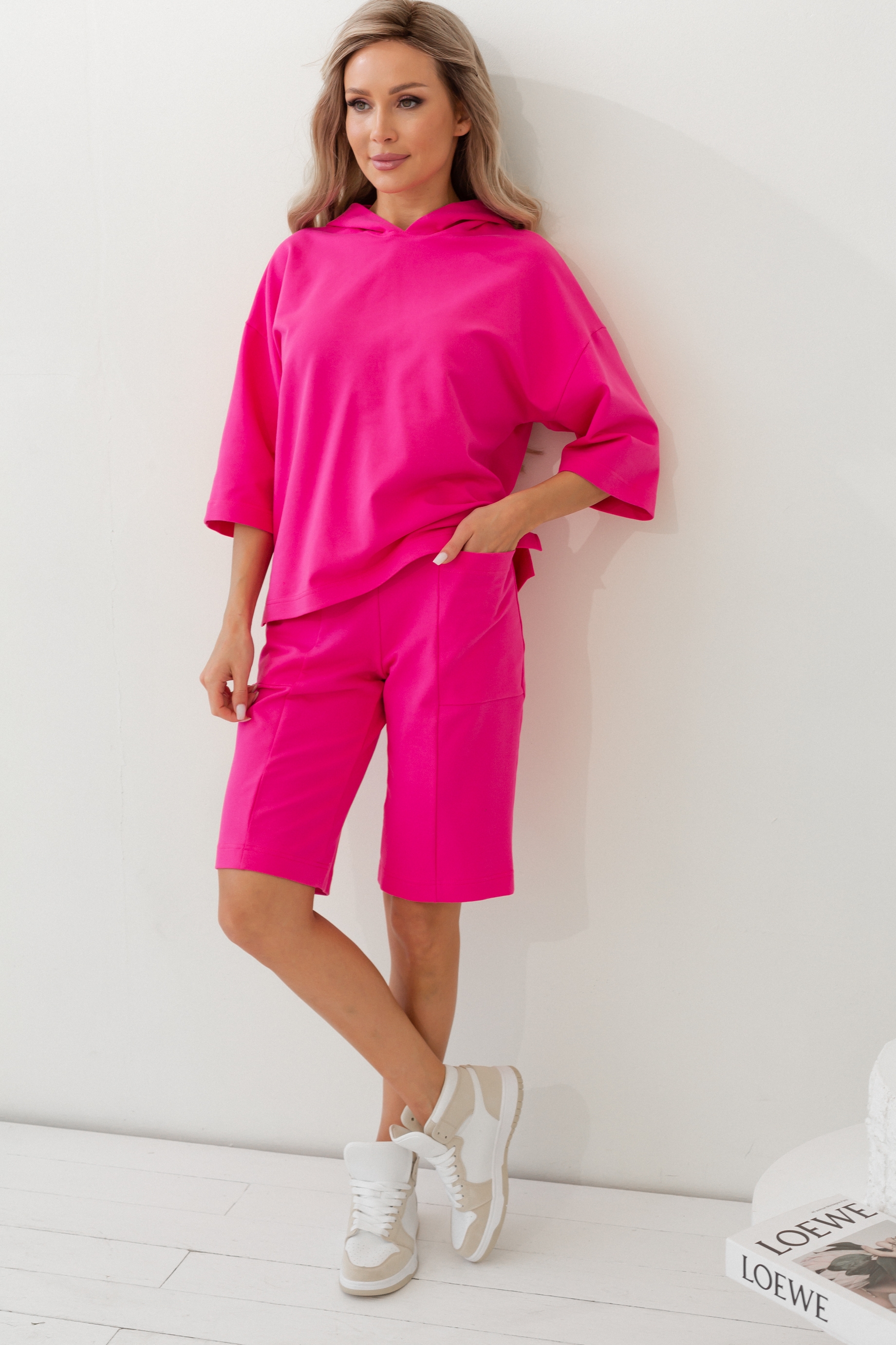 Комфортный костюм в стиле спорт - шик из трикотажного полотна "Футер". Состоит из футболки и шорт. Футболка прямого силуэта с капюшоном. Рукав 3/4 со спущенным плечом. Низ ровный, по бокам разрезы. Шорты с комфортной посадкой на талии, которую обеспечивает эластичный пояс на резинке. Модель имеет функциональные карманы. Идеальный вариант для прогулок и приятных встреч с друзьями.