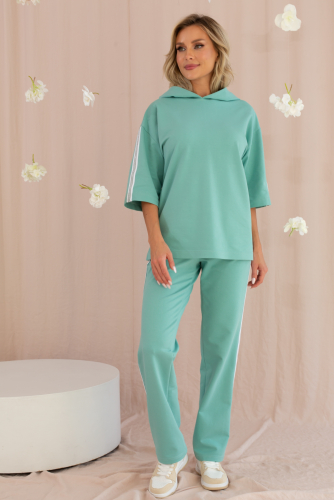 Стильный костюм из трикотажного полотна - Футер. Состоит из толстовки и брюк. Толстовка свободного кроя со спущенным плечом. Длинный рукав со спущенным плечом, оканчивается притачной манжетой. Модель с капюшоном. Низ ассиметричный, оформление манжетой, по бокам разрезы. Брюки с комфортной посадкой на талии, которую обеспечивает пояс на резинке. Брючины оканчиваются широкими манжетами на резинке. Модель имеет функциональные карманы в боковых швах. Идеальный вариант для спорта и отдыха.