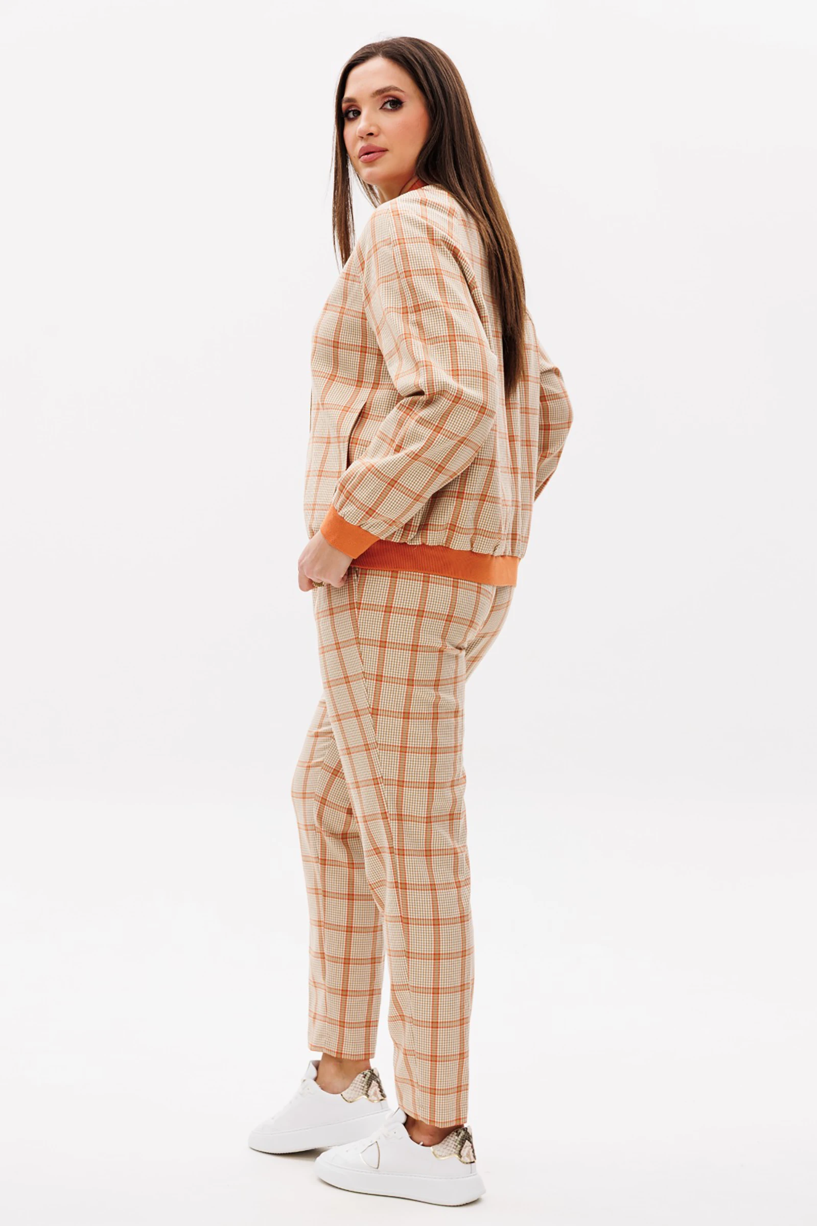 Тэнсол, принц Уэльский, тартан, гусиная лапка. Эти стильные принты помогут выделиться из толпы тем, кто не любит яркие детали. Костюм из такой ткани смотрится выигрышно сам по себе и не требует дополнительных акцентов. Для активных и современных девушек мы предлагаем в весеннем сезоне не стандартный вариант брючного костюма, а смелое сочетание трендовой ткани и спортивного стиля: классические брюки +спортивный бомбер. Согласитесь это смотрится великолепно! Свободный силуэт, покрой реглан, застежка центральная, воротник, манжеты рукавов и низ изделия из отделочной тесьмы-довяза. Полочка с боковым рельефом и карманом. Брюки классического покроя с отрезным поясом (эластичным в области спинки),ж наклонными боковыми карманами и мягкими складками на передних половинках.Длина жакета около 60 см. Длина рукава с плечом около 74 см. Длина брюк около 102 см.