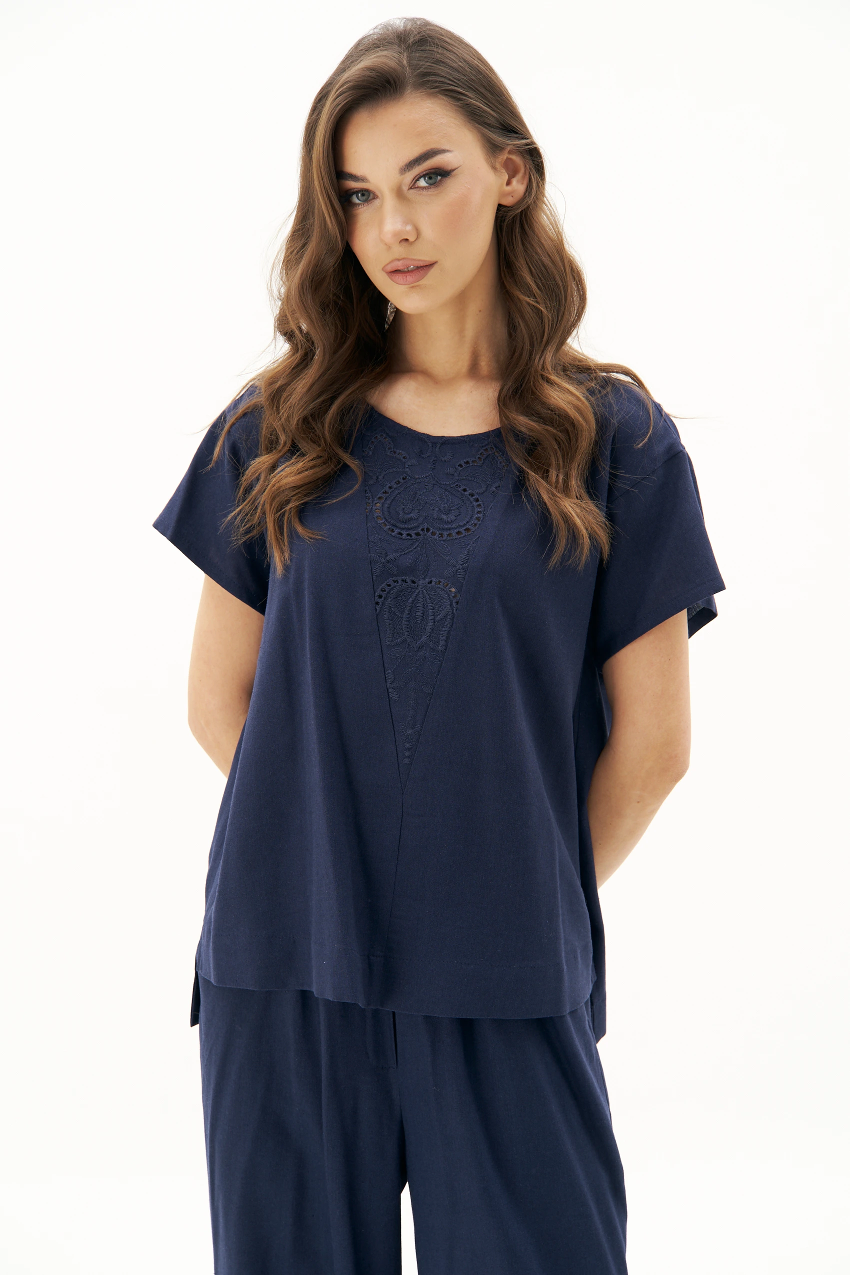 Брючный костюм из смесового льняного полотна с эффектной вышивкой. Он позволяет без усилий создать гармоничный образ, подчёркивая все ваши достоинства и минимизируя те особенности фигуры, которые вам хотелось бы скрыть.Комфортные брюки в расслабленном стиле на эластичном поясе с наклонными боковыми карманами и эффектными коническими вставками по боковому шву из вышитого полотна.Блуза свободная, покрой с заниженной линией плеча, рукав свободный, круглый вырез горловины и коническая вставка по центру переда.Спинка с центральным швом и застежкой- каплей. Низ изделия - разноуровневый.Длина брюк около 104 см.Длина блузы около 67 см.Длина рукава 12 см.