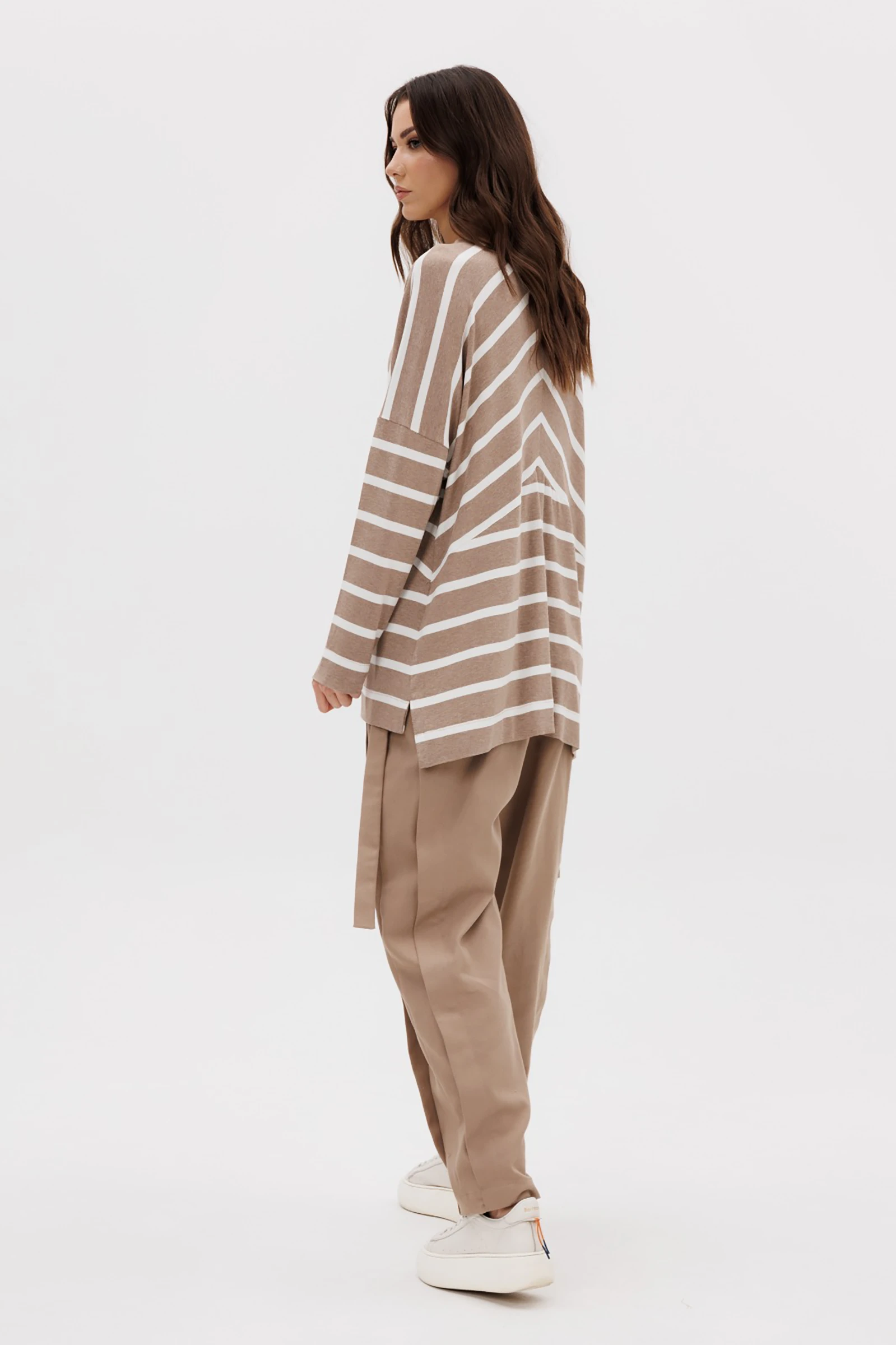 Этот брючный комплект-максимум стиля и практичности. Его легко можно "разобрать" на составные части и сочетать с другими вещами. Он акцентирует внимание на вашей индивидуальности и делает комфорт приоритетам! Свободный упрямленный джемпер в полоску из трикотажа и супер трендовые брюки из хлопкового габардина. Джемпер упрямленный, с заниженной линией плеча, боковыми разрезами и разноуровневым низом.