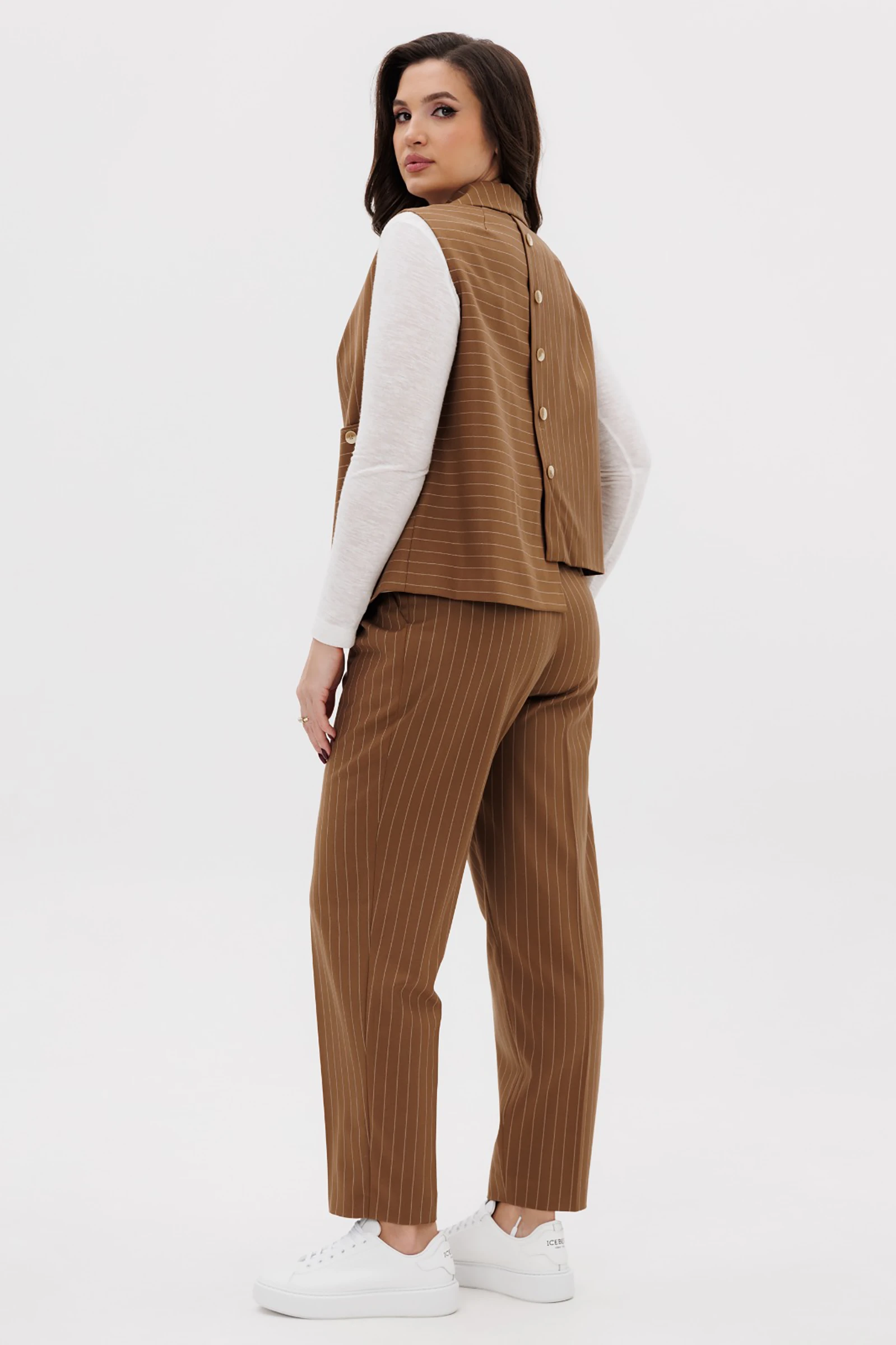 Костюм с жилетом - прекрасное решение для смелых экспериментов. Выполненный в актуальной цветовой гамме, он позволяет дополнять себя различными аксессуарами и создавать каждый раз новые актуальные образы. Жилет прямого силуэта с центральной застёжкой и фигурным разноуровневым бортом. Спинка с декоративной разноуровневой планкой, которая имитирует застежку. Брюки классического покроя с высокой посадкой на притачном поясе со шлёвками, зауженные. Застежка брючная на потайной крючок и молнию. Передние половинки брюк с мягкими складками-защипами и наклонными боковыми карманами. Задние половинки брюк с вытачками и прорезными карманами с листочками.