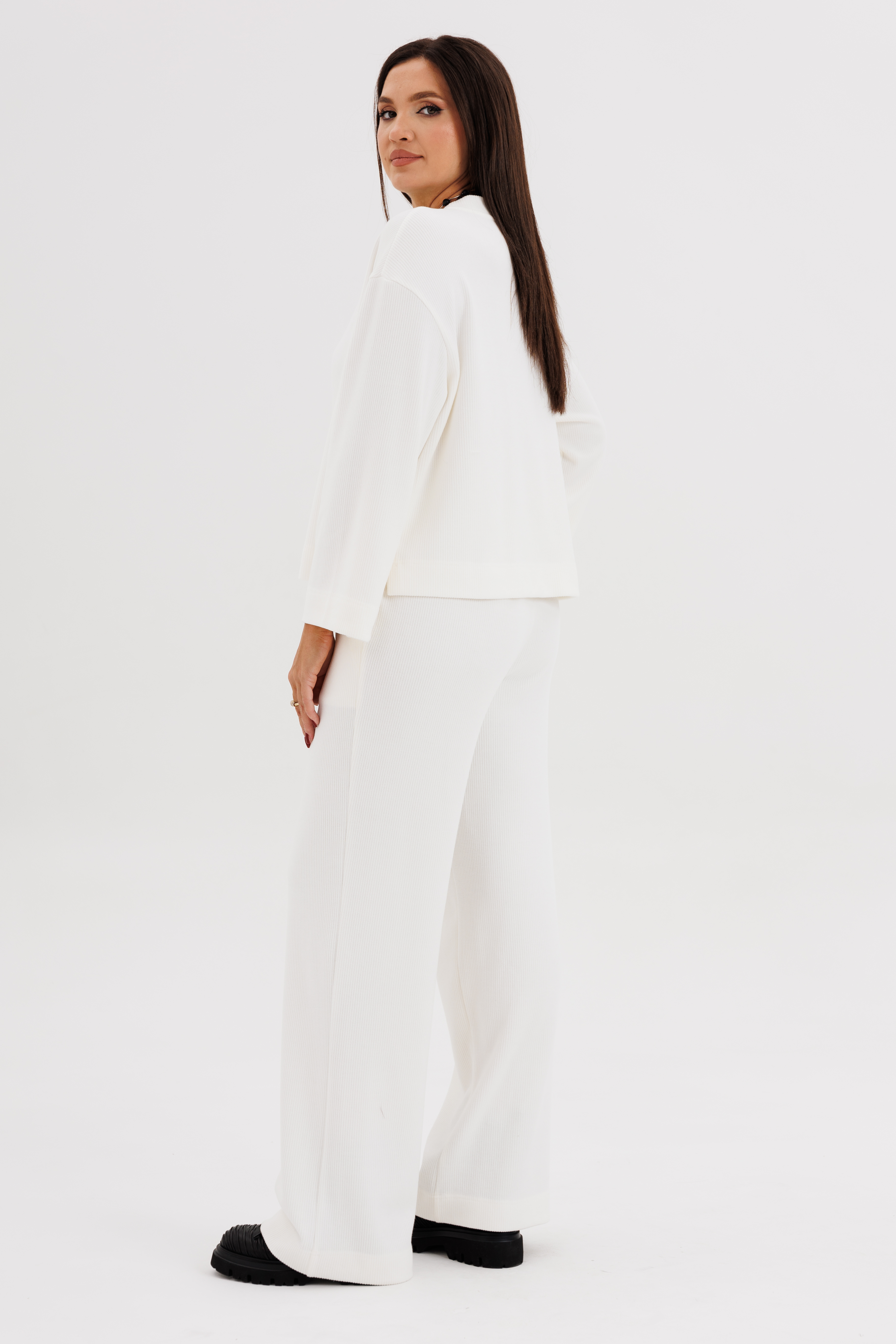 Такой вариант неформального костюма можно отметить отдельно-это настоящий шик, который в любой обстановке смотрится по-особенному. Невероятное ощущение расслабленности и комфорта обеспечивает удобный покрой и тактильно уютный трикотаж с эффектом вельвета. Брюки свободного кроя, прямые, с наклонными боковыми карманами , на эластичном поясе с люверсами и отделочным шнуром. Джемпер рубашечного покроя,  свободный, слегка укороченный. Горловина круглая с притачной обтачкой. Рукав рубашечный расширенный к низу.
