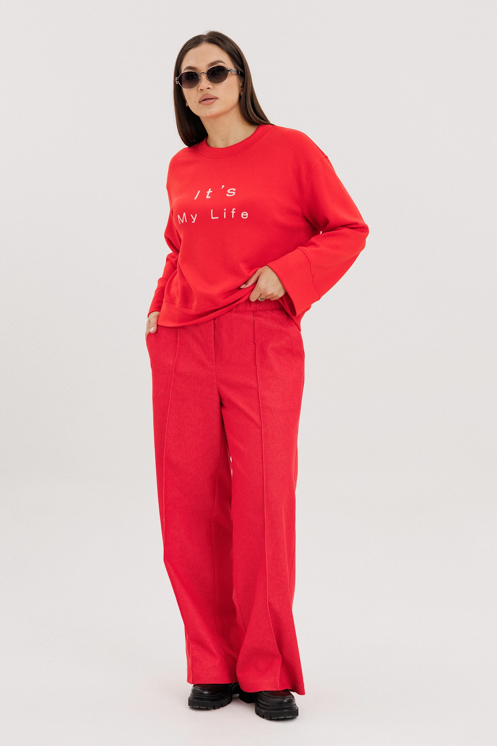Брюки в расслабленном стиле, на эластичном поясе с наклонными боковыми карманами и кантом-защипом по передним половинкам брюк.