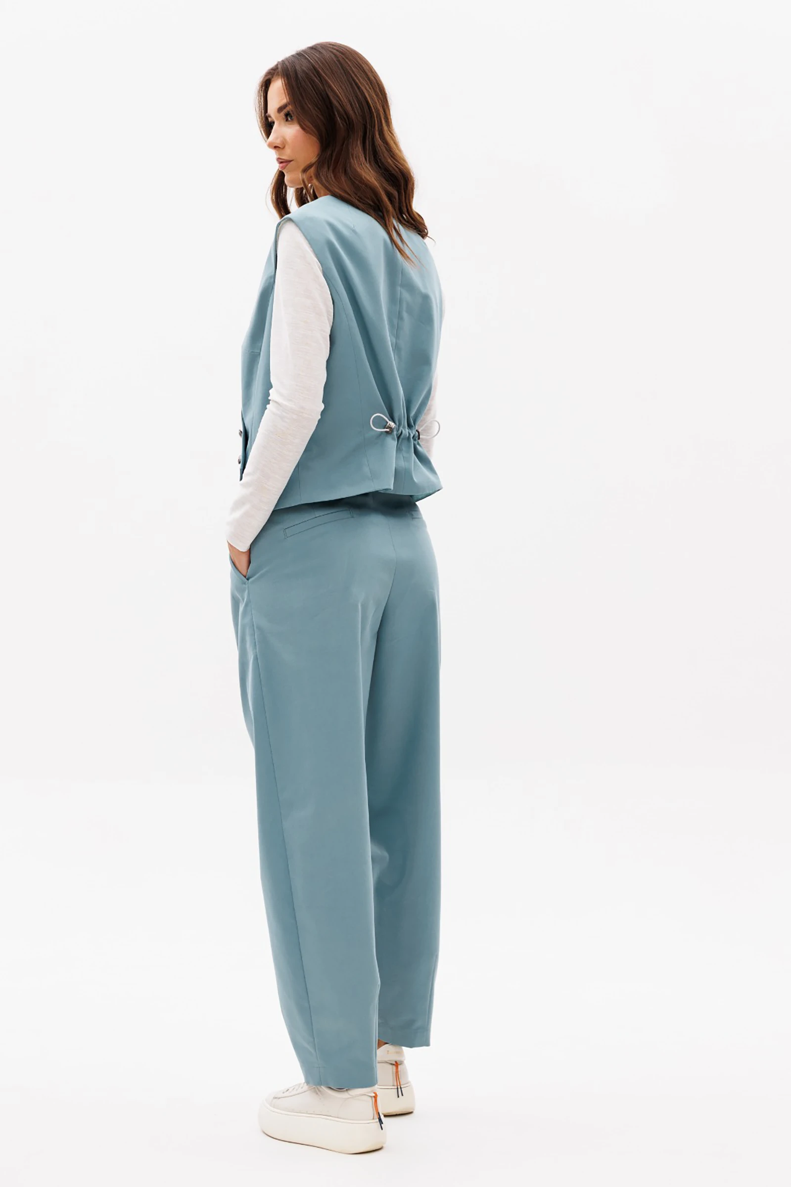 Костюм с жилетом - прекрасное решение для смелых экспериментов.  Жилет полуприлегающего силуэта с асимметричной застёжкой, фигурной линией низа и регулирующийся кулисе по спинке. Полочки с отрезным бочком и нагрудными вытачками, спинки - с центральным швом, отрезным бочком и регулирующийся кулисой с фиксаторами. Брюки "баррел" на притачном поясе со шлёвками (эластичном в области спинки), с наклонными карманами , мягкими складками защипами по верху брюк и вытачками по низу. Джемпер трикотажный, с длинным рукавом, полуприлегающего силуэта.