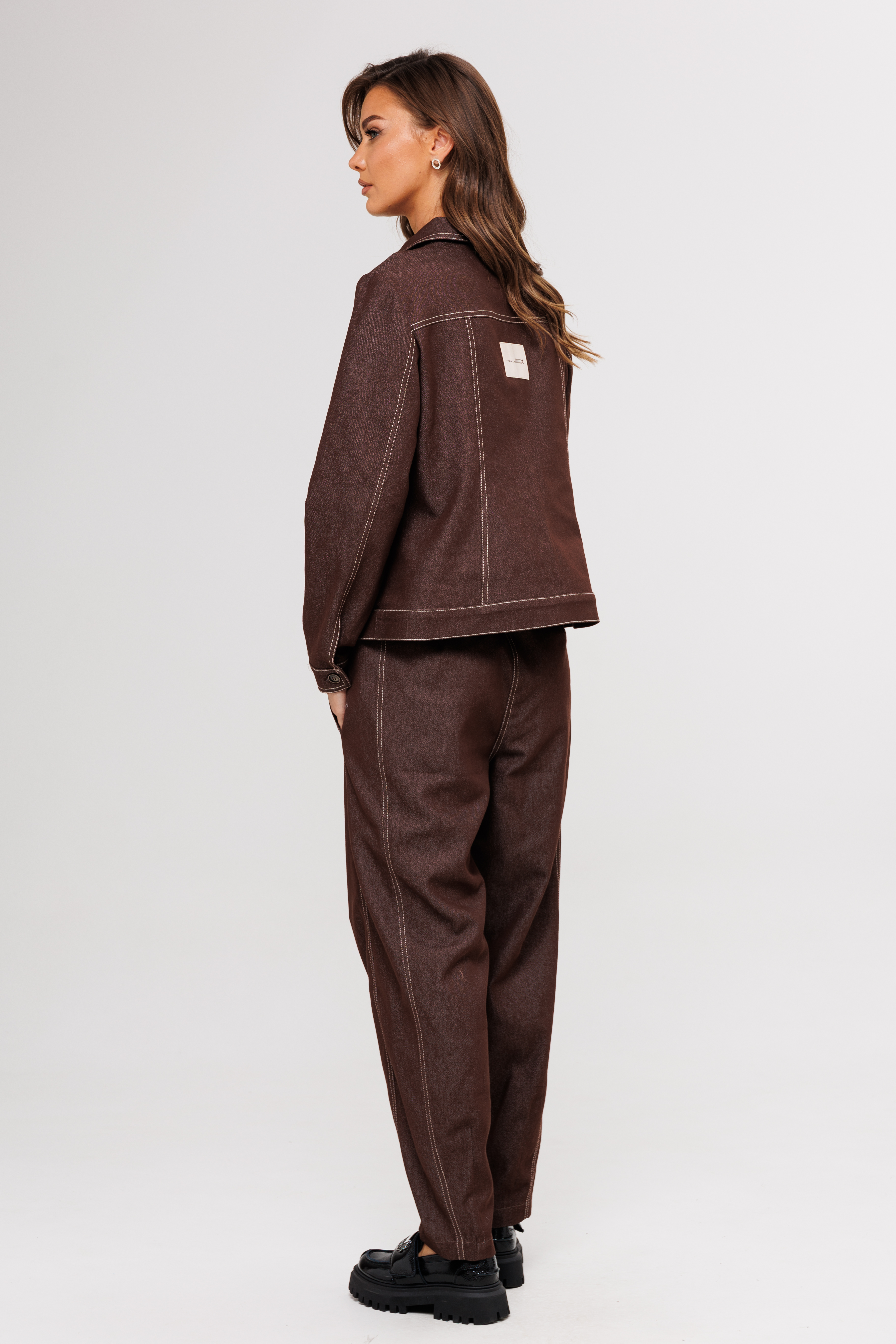 Брюки в расслабленном стиле, на притачном поясе со шлевками, эластичным в области спинки, с отрезным широким компасом по боковому шву и карманом по передним половинкам. Все швы на изделии выполнены контрастной строчкой.