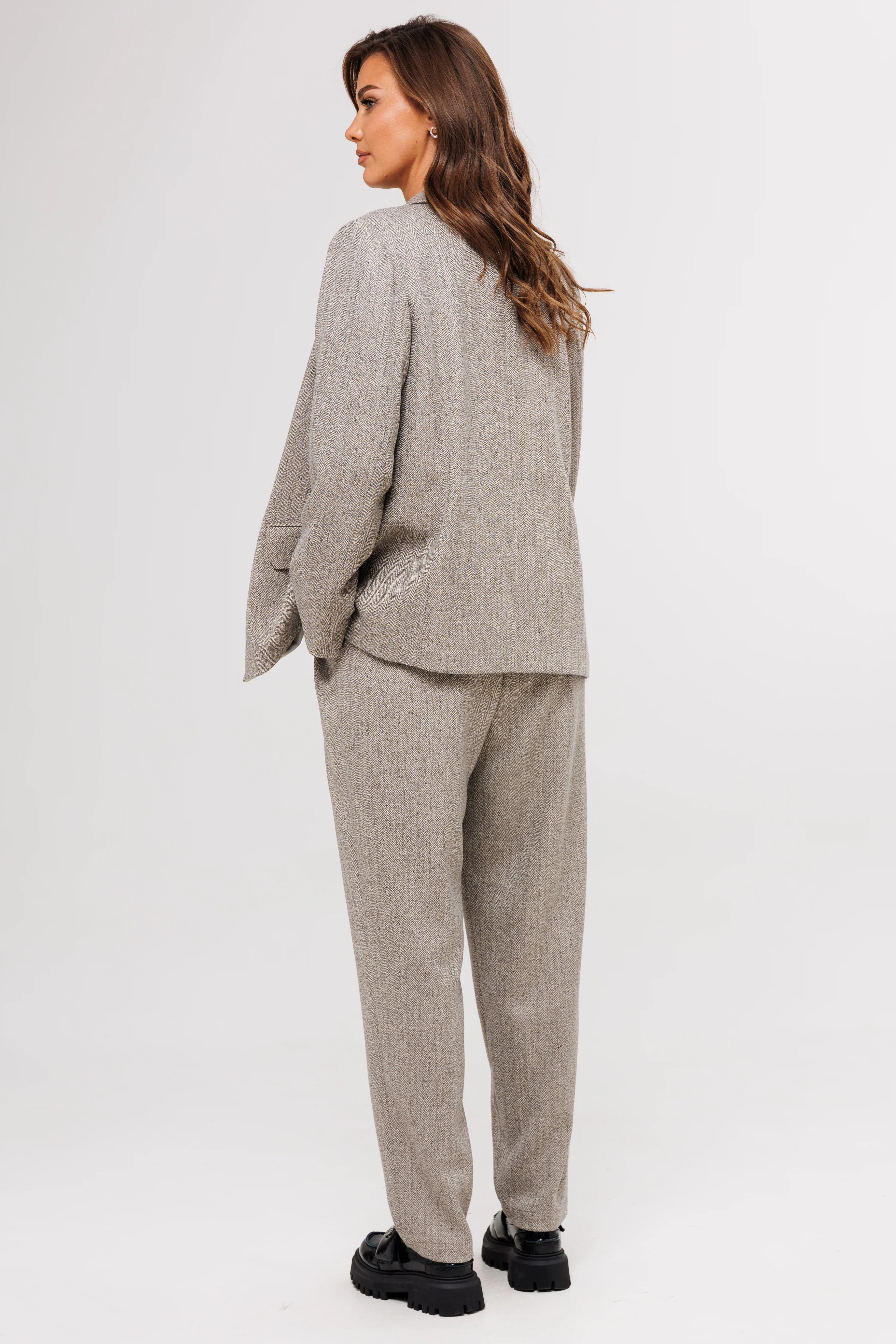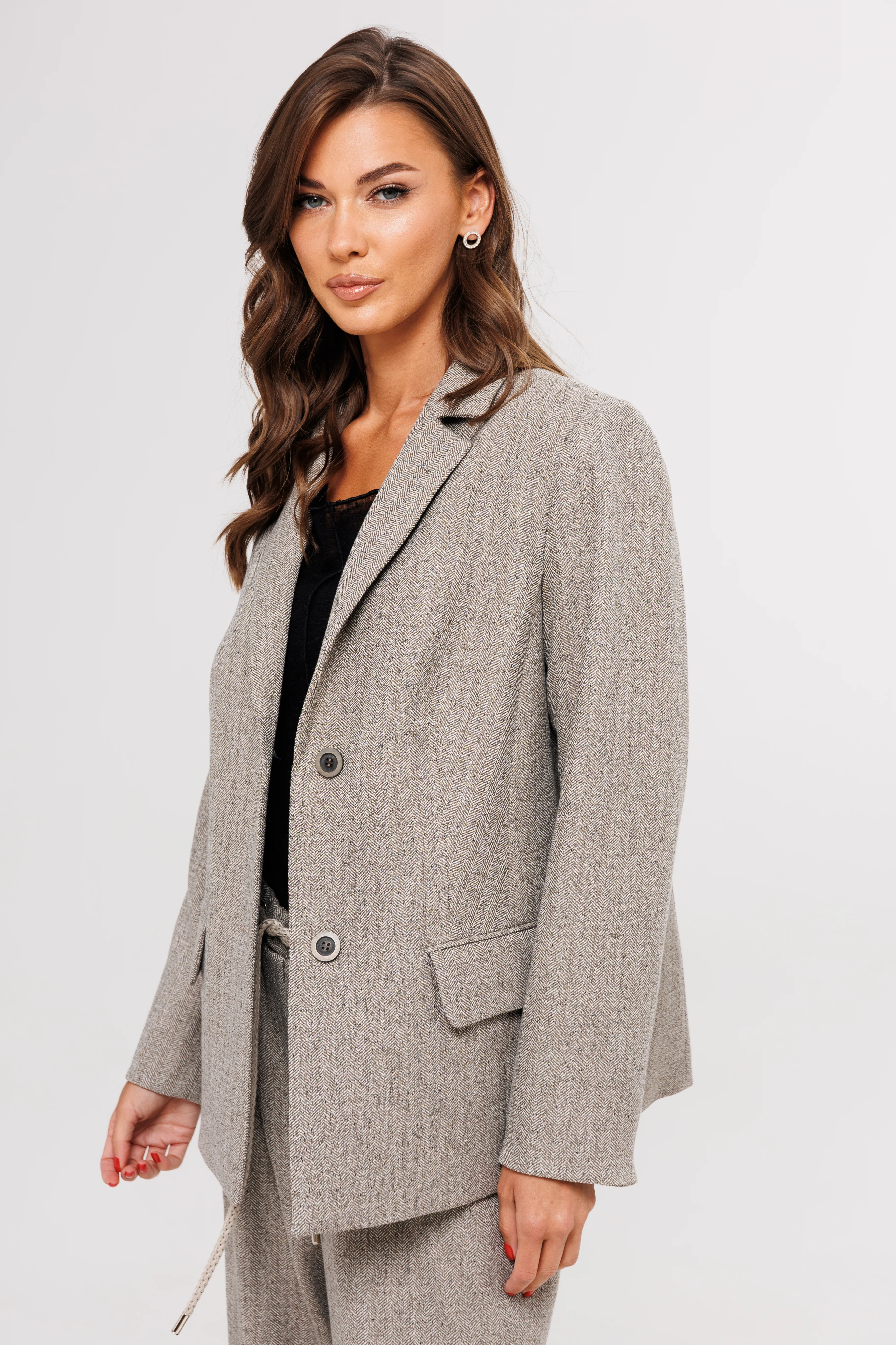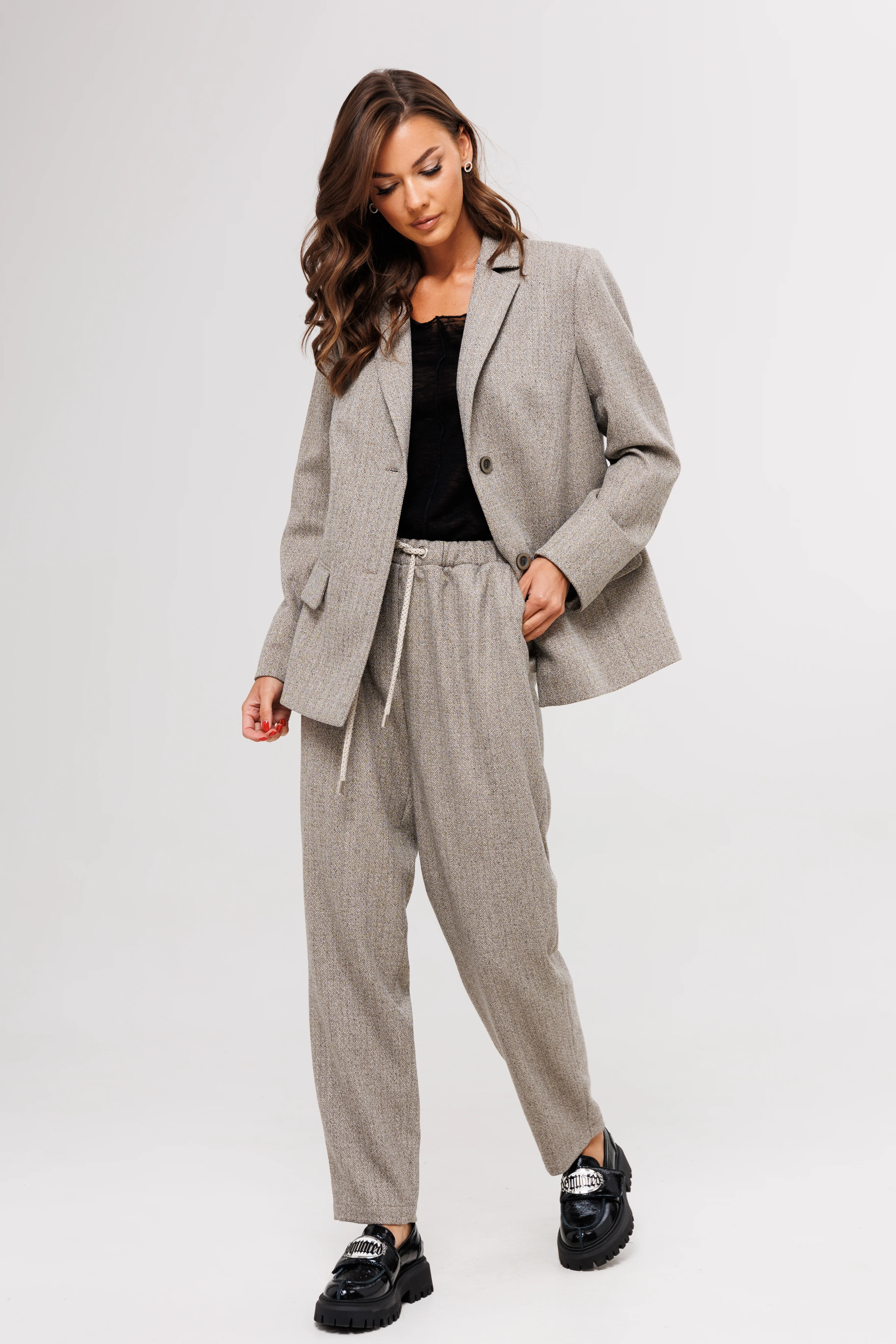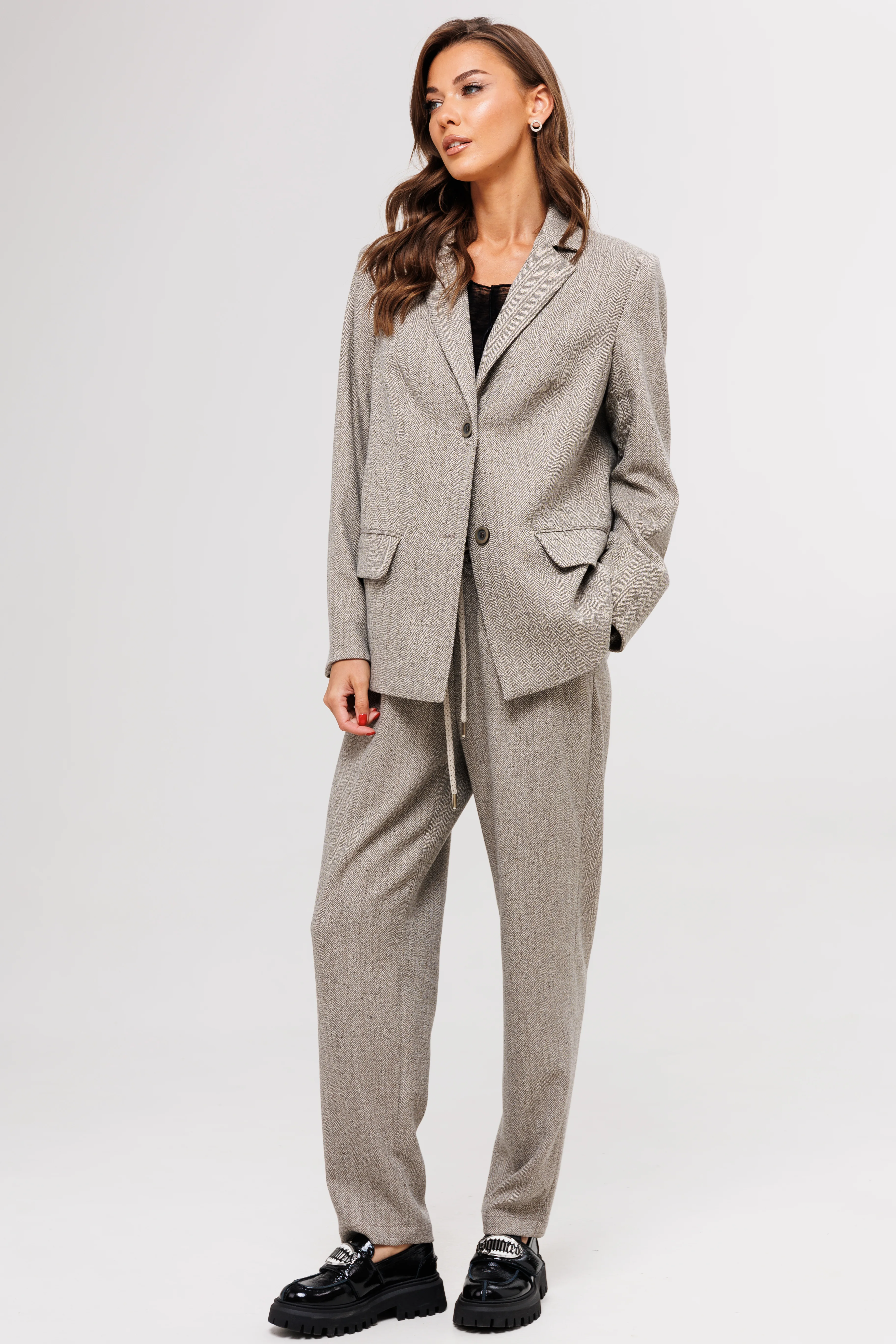 Силуэт свободный, слегка упрямлённый, покрой-втачной, воротник классический английский, линия борта фигурная, застёжка на две петли и пуговицы. Полочка с отрезным бочком, нагрудной вытачкой и прорезным карманом с клапаном. Спинка со средним швом и талиевой вытачкой. Рукав двухшовный с отлетной шлицей и отделочными пуговицами. Брюки свободные, на эластичном поясе с люверсами и отделочным шнуром. Передние половинки с боковыми накладными карманами. Длина пиджака около 67 см, длина рукава около 60 см. Длина брюк около 98 см