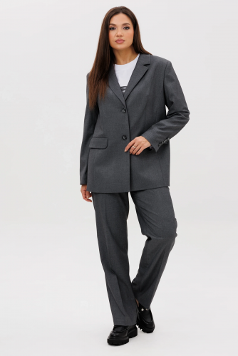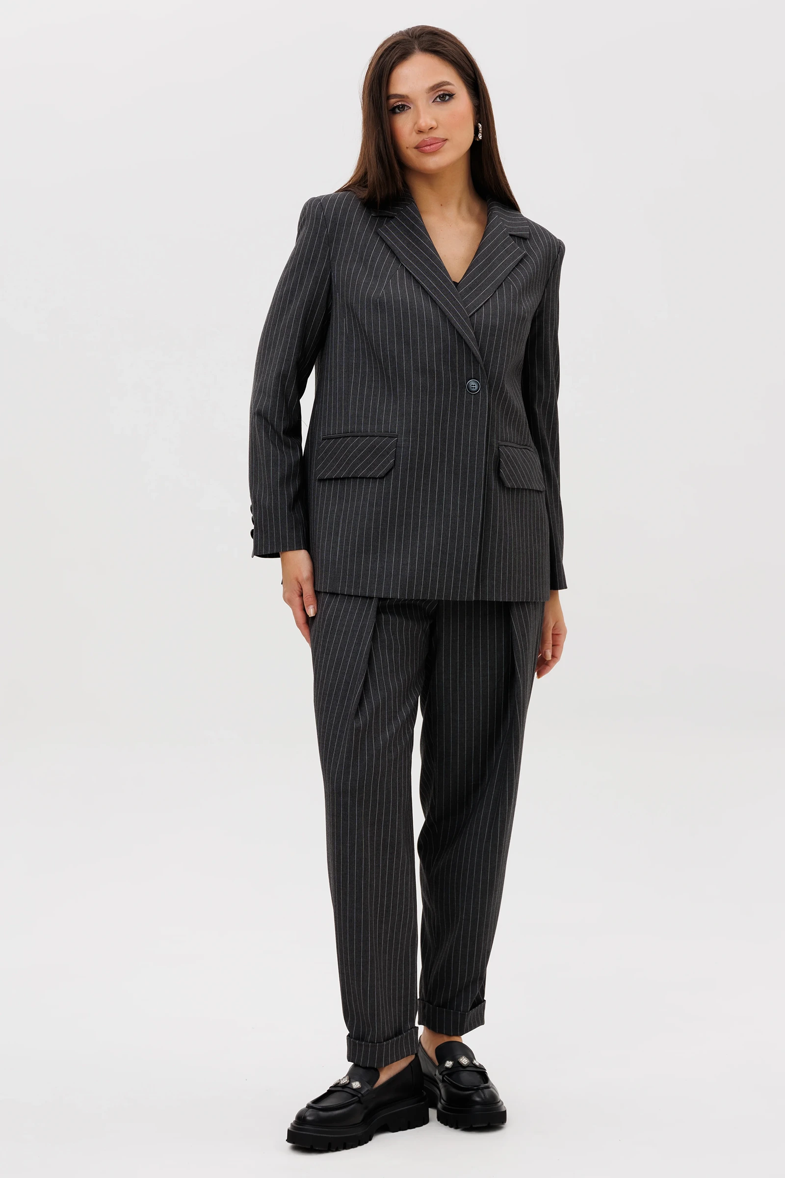 Жакет свободного упрямленного силуэта, втачного покроя, со смещенной застежкой и классическим английским воротником. Полочка с нагрудной вытачкой от линии лацкана, меняющей направление полоски в верхней части, прорезным карманом с рамкой и клапаном.