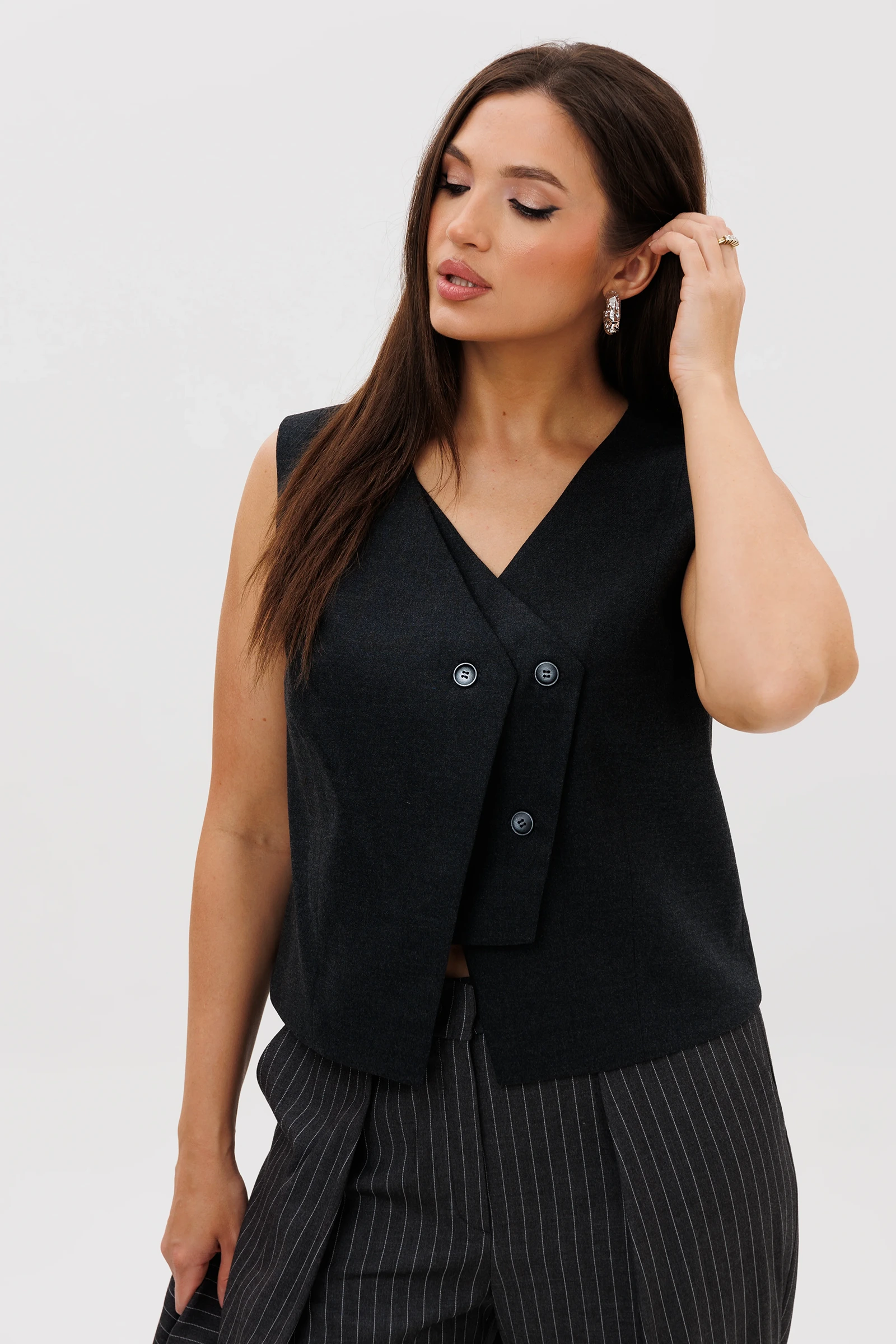 Жилет полуприлегающий, со сложным фигурным бортом, отрезным бочком, нагрудной вытачкой и средним швом и рельефом по спинке.