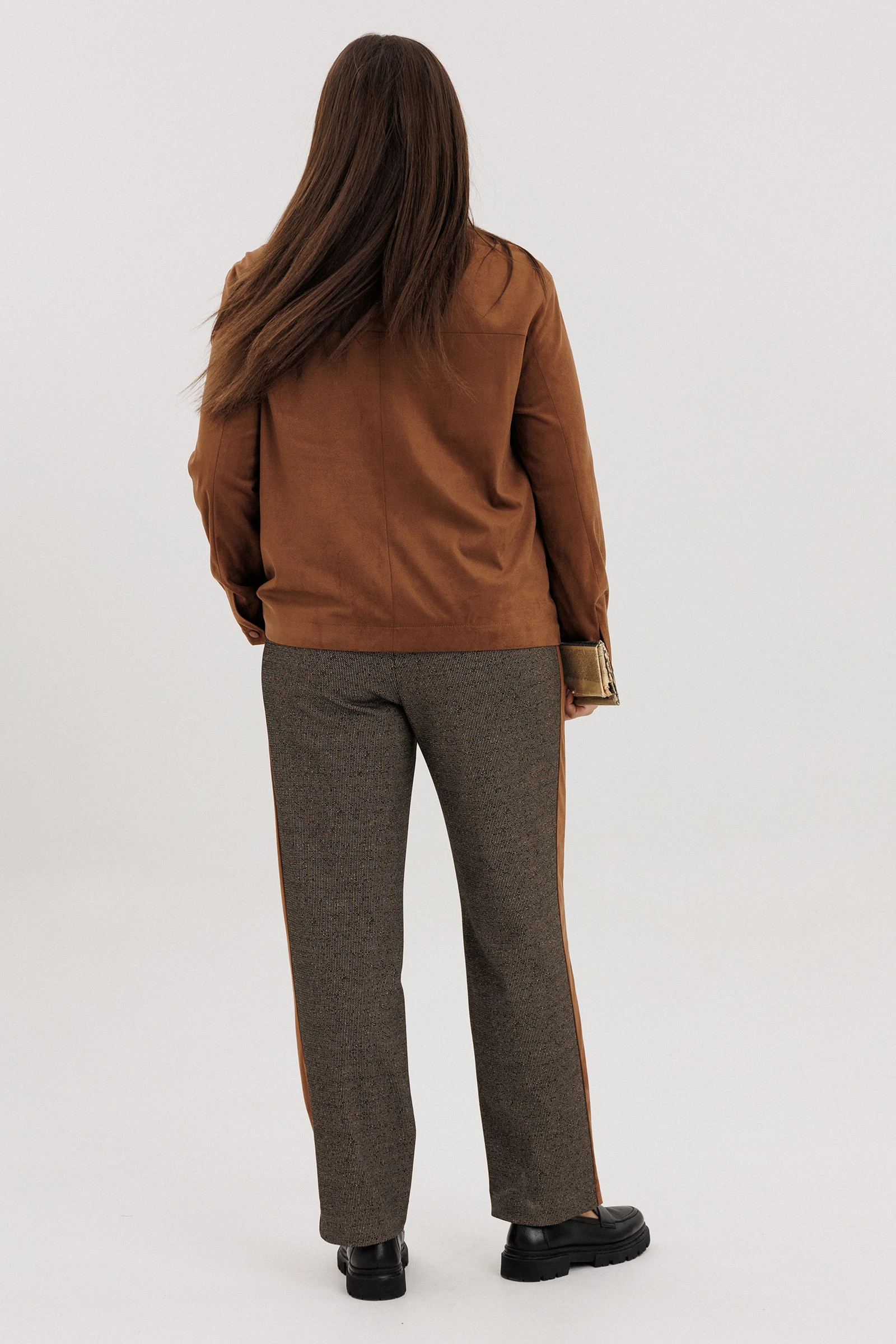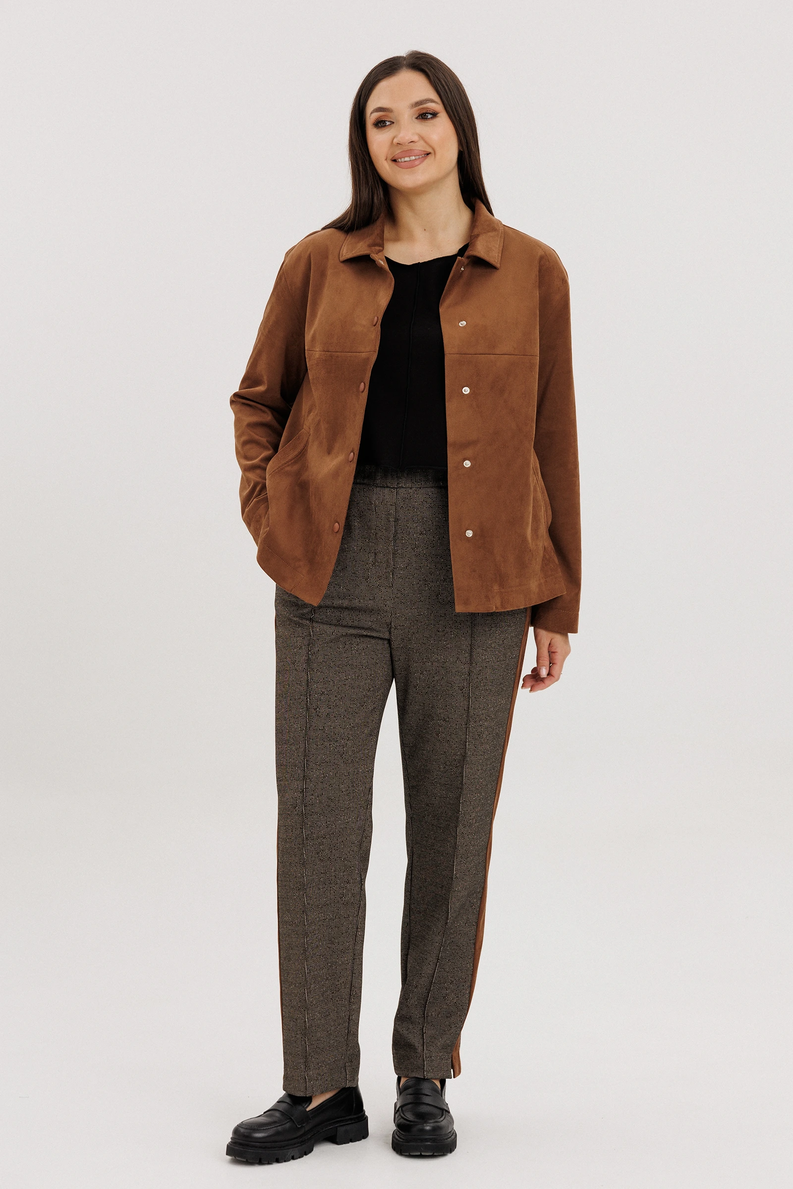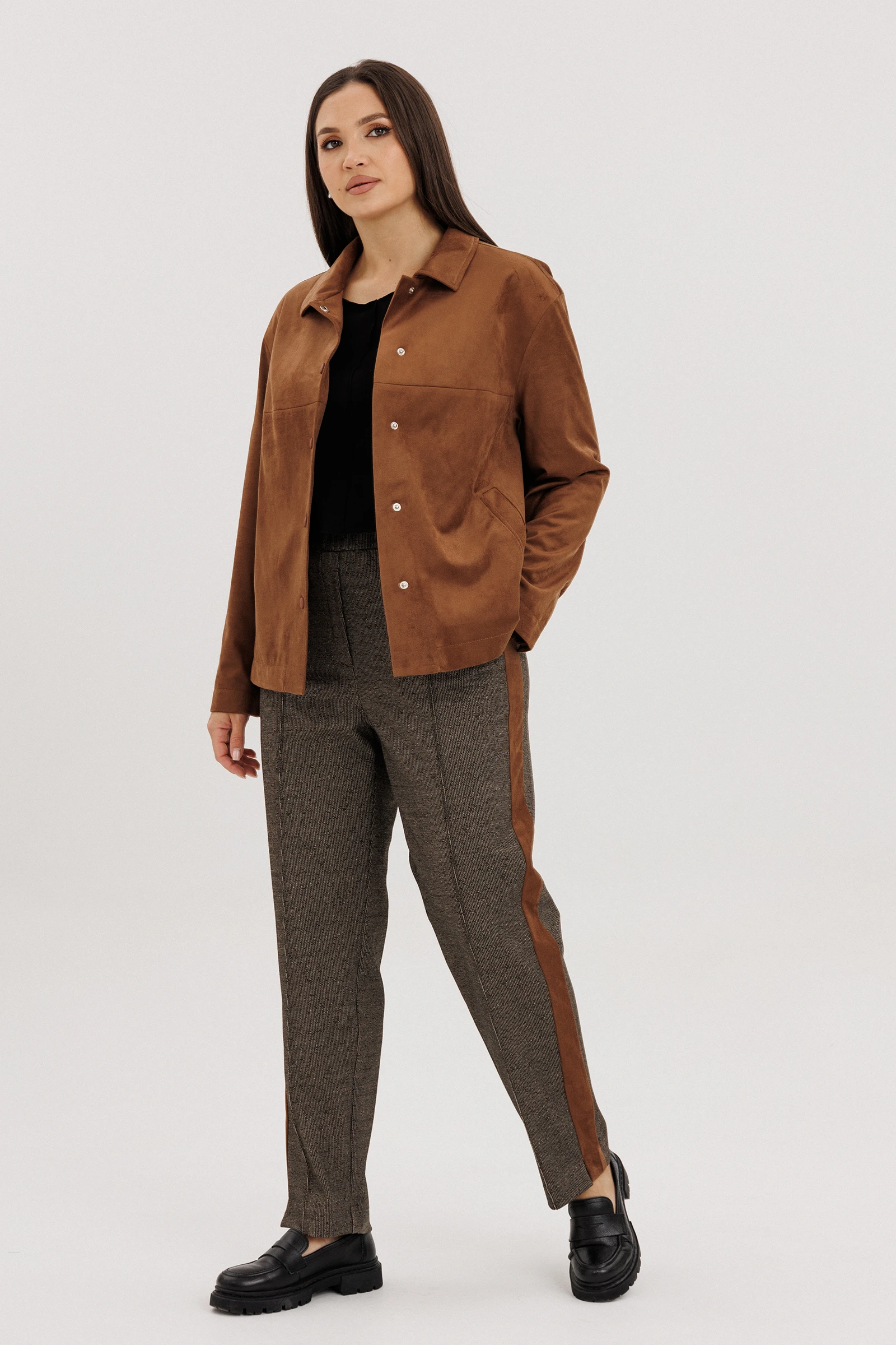 Стильный женский брючный костюм в стиле смарт-кэжуал сочетает комфорт и элегантность. Рубашка выполнена из замшевой ткани, брюки из трикотажа с декоративными замшевыми вставками. Идеальный выбор для офиса, деловых встреч и повседневных образов.