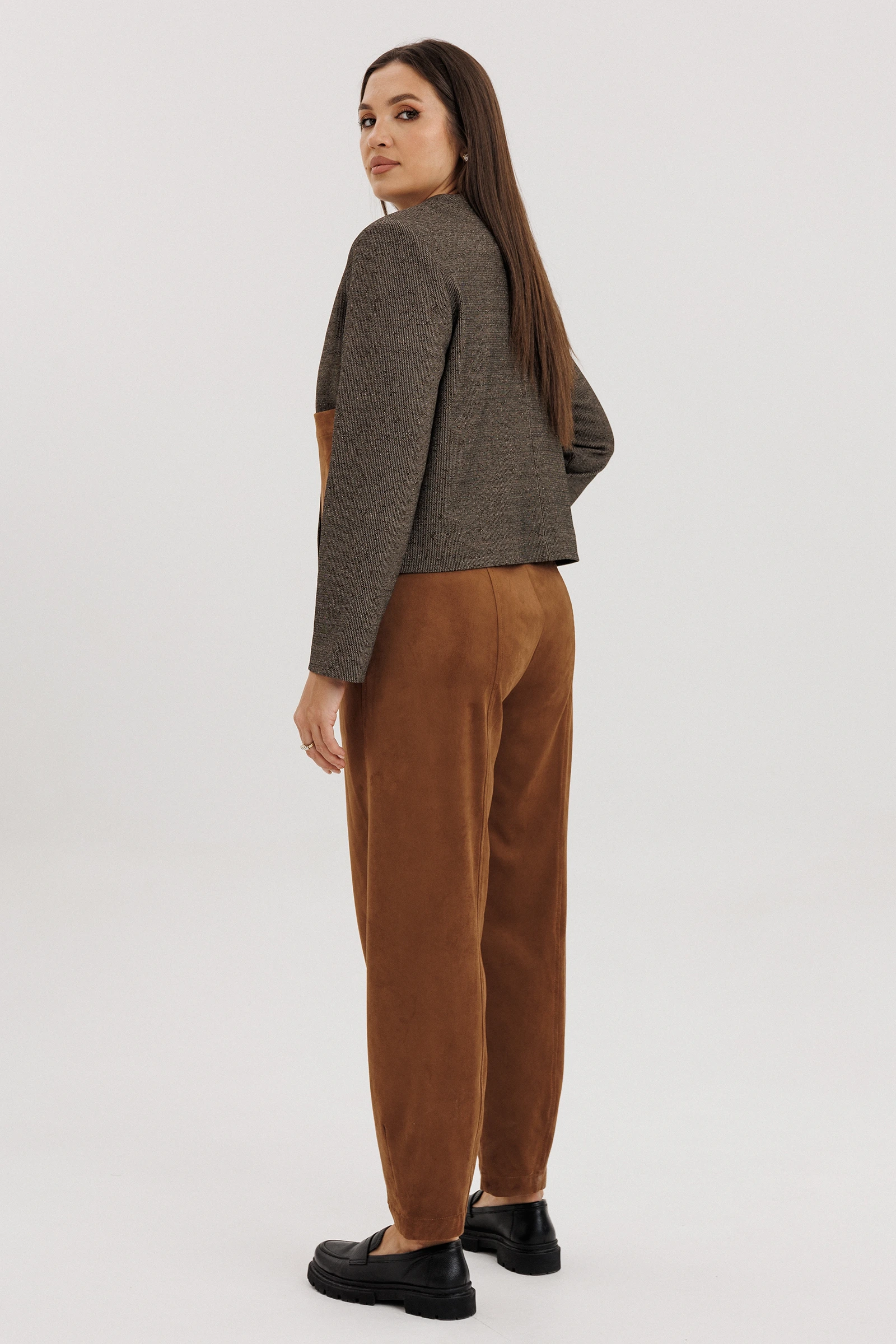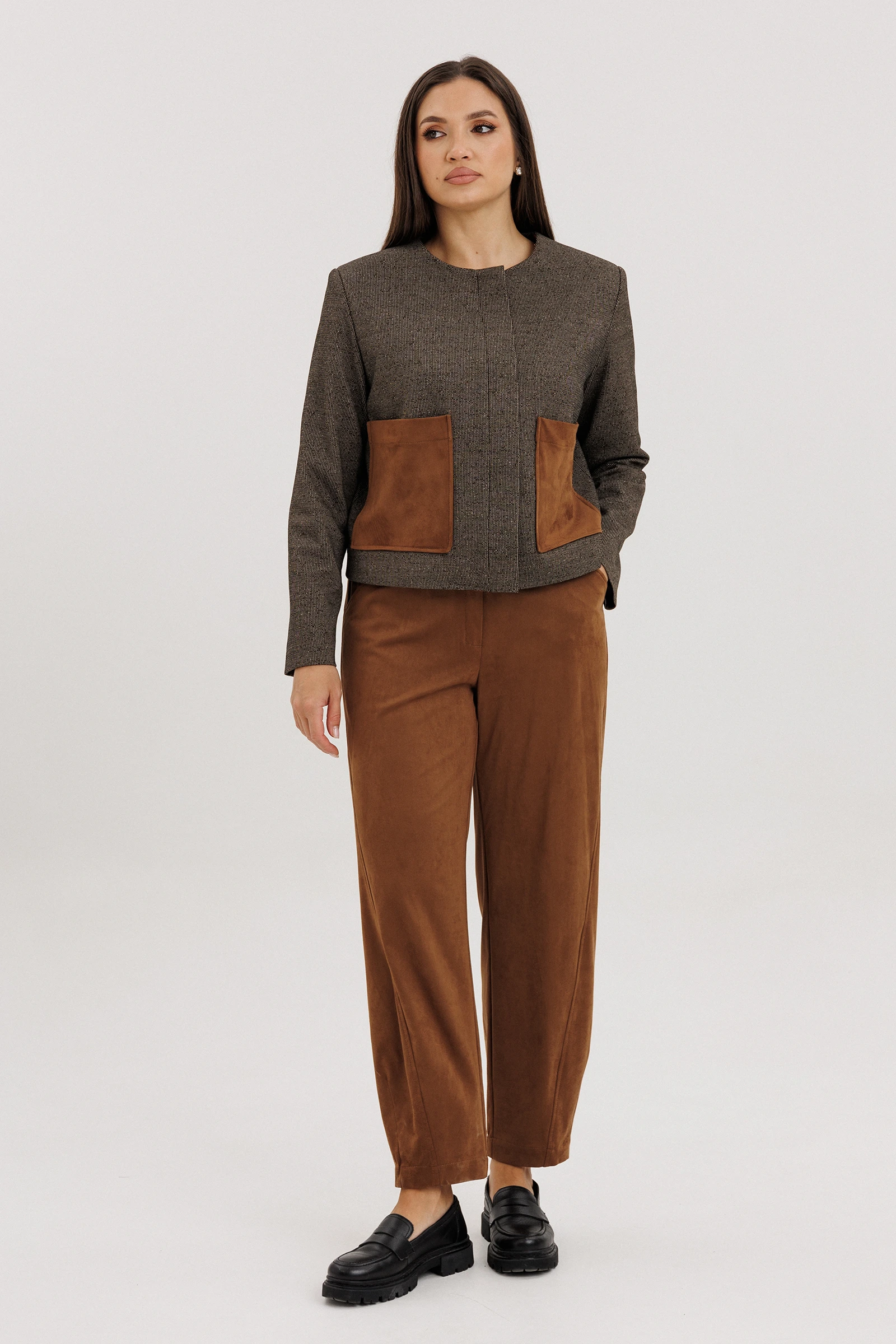 Жакет прямого кроя с округлым вырезом и длинными рукавами дополнен эффектными замшевыми карманами — стильный акцент, который выделит вас из толпы.