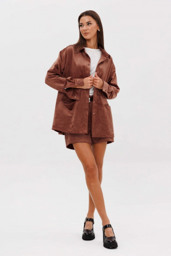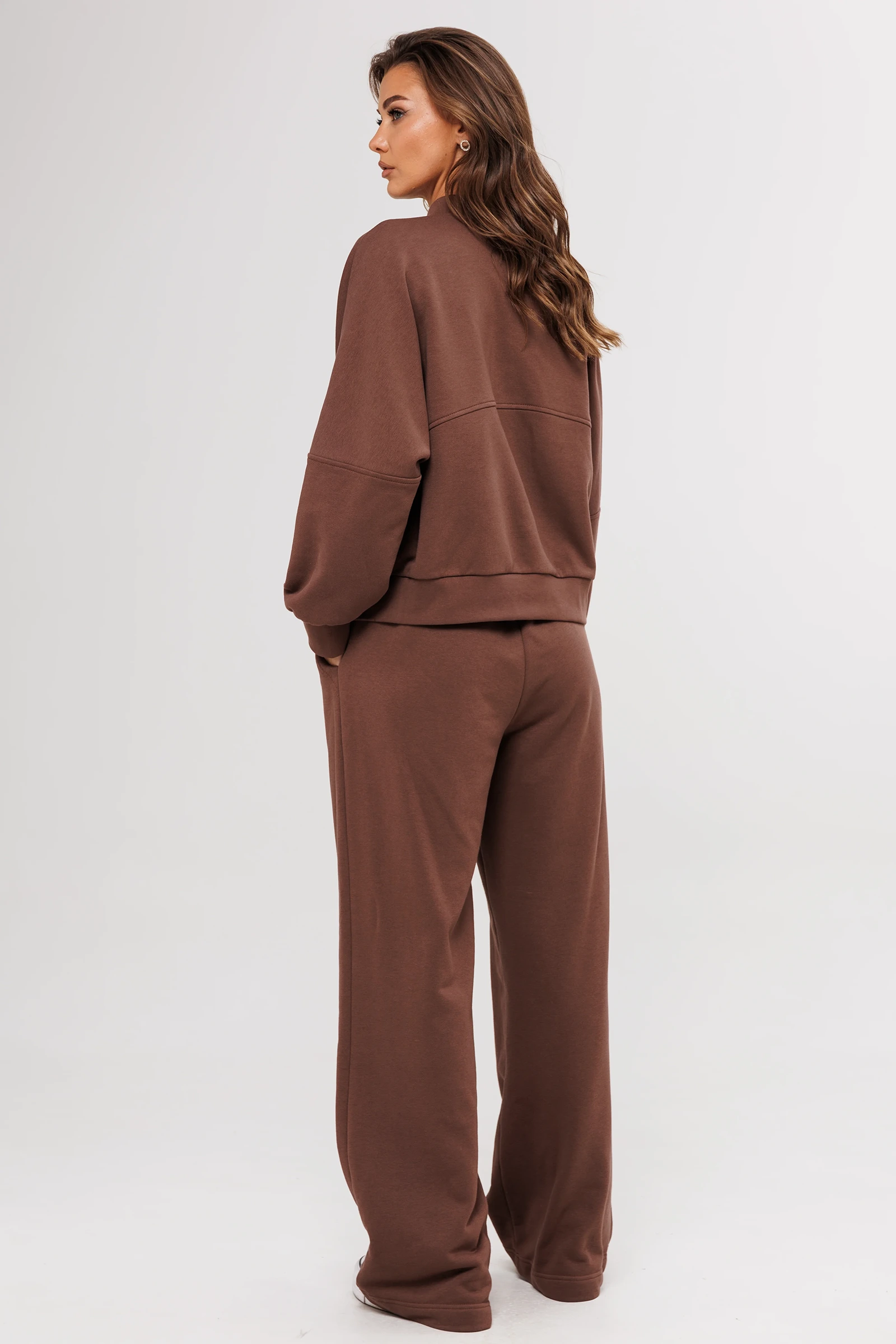 Спортивный костюм сегодня - это не только одежда для спорта гардероба любой современной девушки - он является ещё и элементом стиля.Спортивный костюм в шоколадном цвете будет уместен везде и всегда, несмотря на любые веяния моды.Костюм состоит из свободной лёгкой куртки и прямых брюк. Акцентом в куртке служит разъёмная тесьма-молния леопардового цвета. Цельнокроеный покрой актуален, он идеально обеспечивает свободу движений. Воротник в виде мягкой стойки, по переду спинки и рукавам - акцентные рельефы, подчёркнутые отделочными строчками. Для удобства использования - прорезные карманы с листочками.Низ куртки и рукавов - на притачных манжетах.Брюки свободные, с вертикальными защипами-стрелками на передних половинках визуально удлиняют и стройнят. Предусмотрены боковые карманы. Пояс брюк с эластичной лентой и регулировкой на шнур спереди.Фурнитура - металлическая тесьма, эмблема на спинке, текстильный шнур.Длина изделия по спинке-около 58 см.Длина рукава от шва притачивания воротника с плечом - около 72 см.Длина брюк около 106 см.