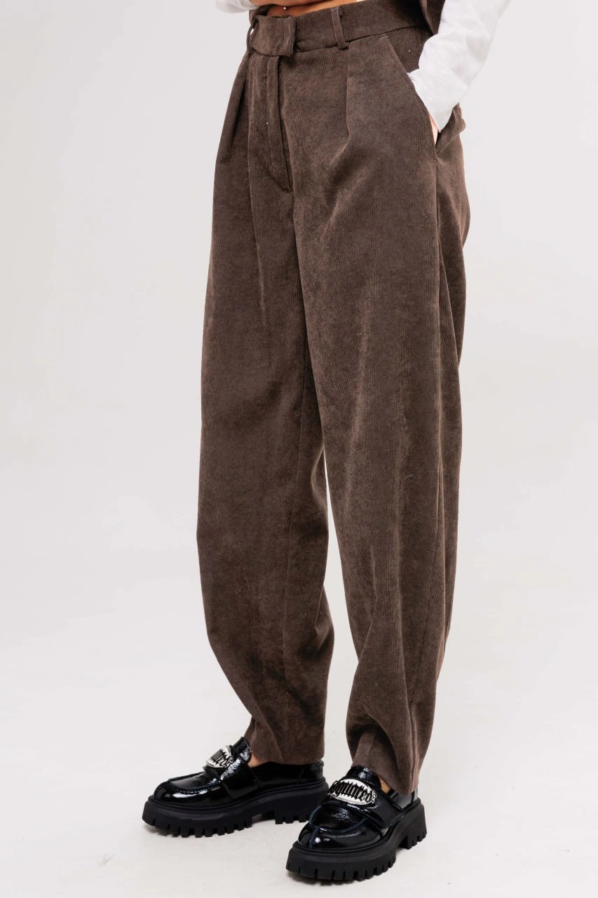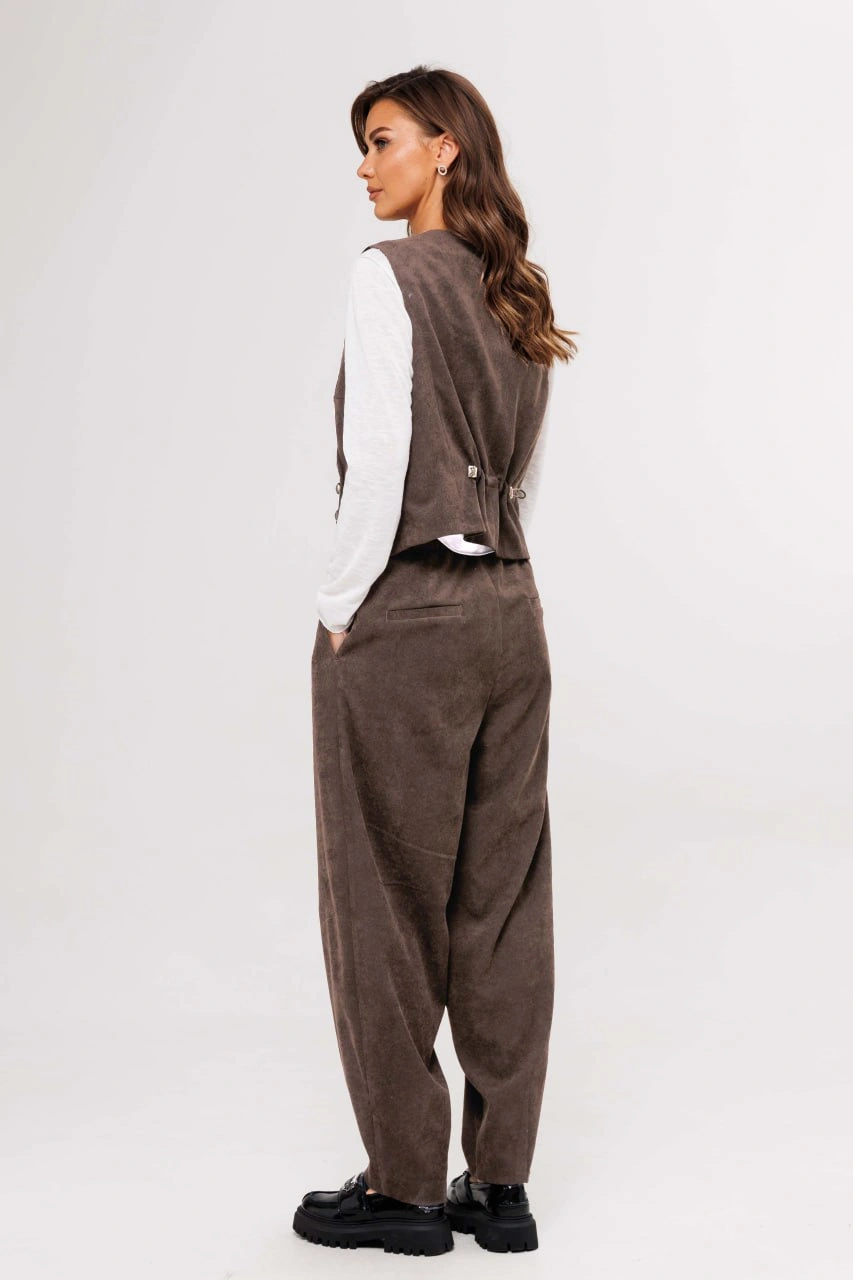 Костюм с жилетом - прекрасное решение для смелых экспериментов. Выполненный в ахроматической цветовой гамме, он позволяет дополнять себя различными аксессуарами и создавать каждый раз новые актуальные образы. Жилет полуприлегающего силуэта с асимметричной застёжкой, фигурной линией низа и регулирующийся кулисе по спинке. Полочки с отрезным бочком и нагрудными вытачками, спинки - с центральным швом, отрезным бочком и регулирующийся кулисой с фиксаторами. Брюки "баррел" на притачном поясе со шлёвками (эластичном в области спинки), с наклонными карманами , мягкими складками защипами по верху брюк и вытачками по низу. Джемпер трикотажный, с длинным рукавом, полуприлегающего силуэта.