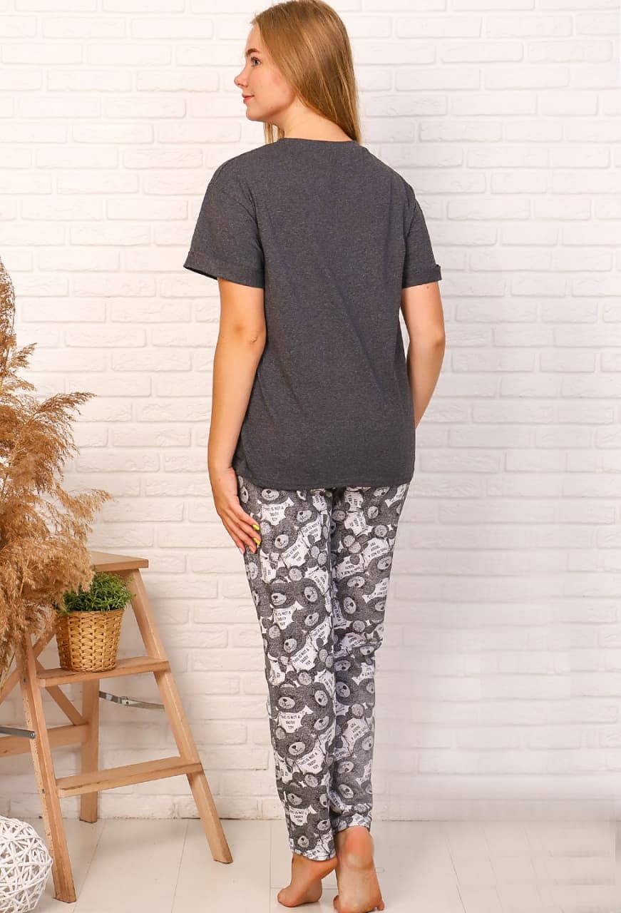 Симпатичный и удобный костюм для дома.Футболка прямого кроя, на полочке печатный принт. Брючки зауженные, с удобными боковыми карманами, пояс на широкой резинке.